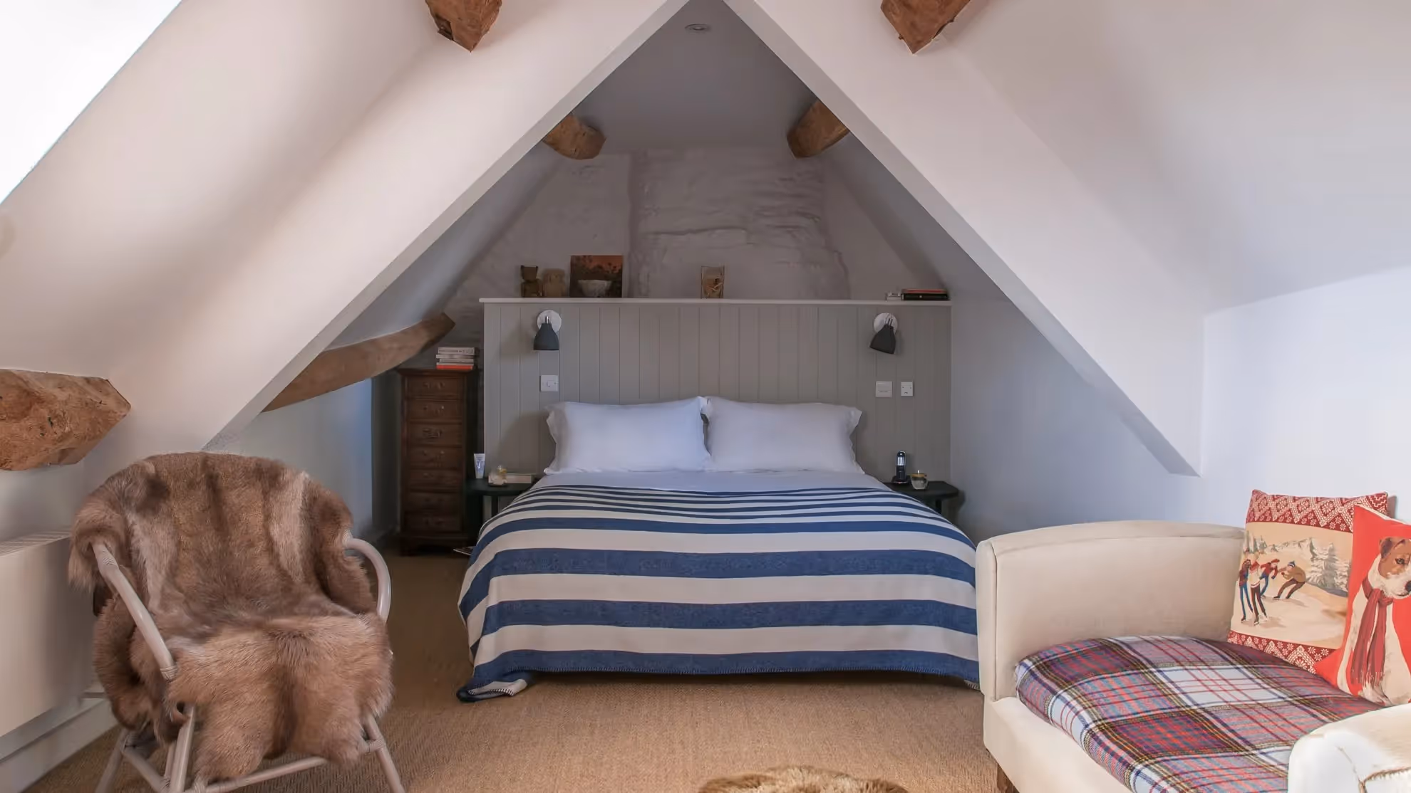 The kitchen is well equipped for entertaining, with modern appliances and a dining table that comfortably seats up to ten. The sitting room centres around an impressive inglenook fireplace, offering a cosy setting for evenings by the fire. A curtained study with its own wood burner and double sofa bed can serve as a quiet retreat or optional fourth sleeping space.