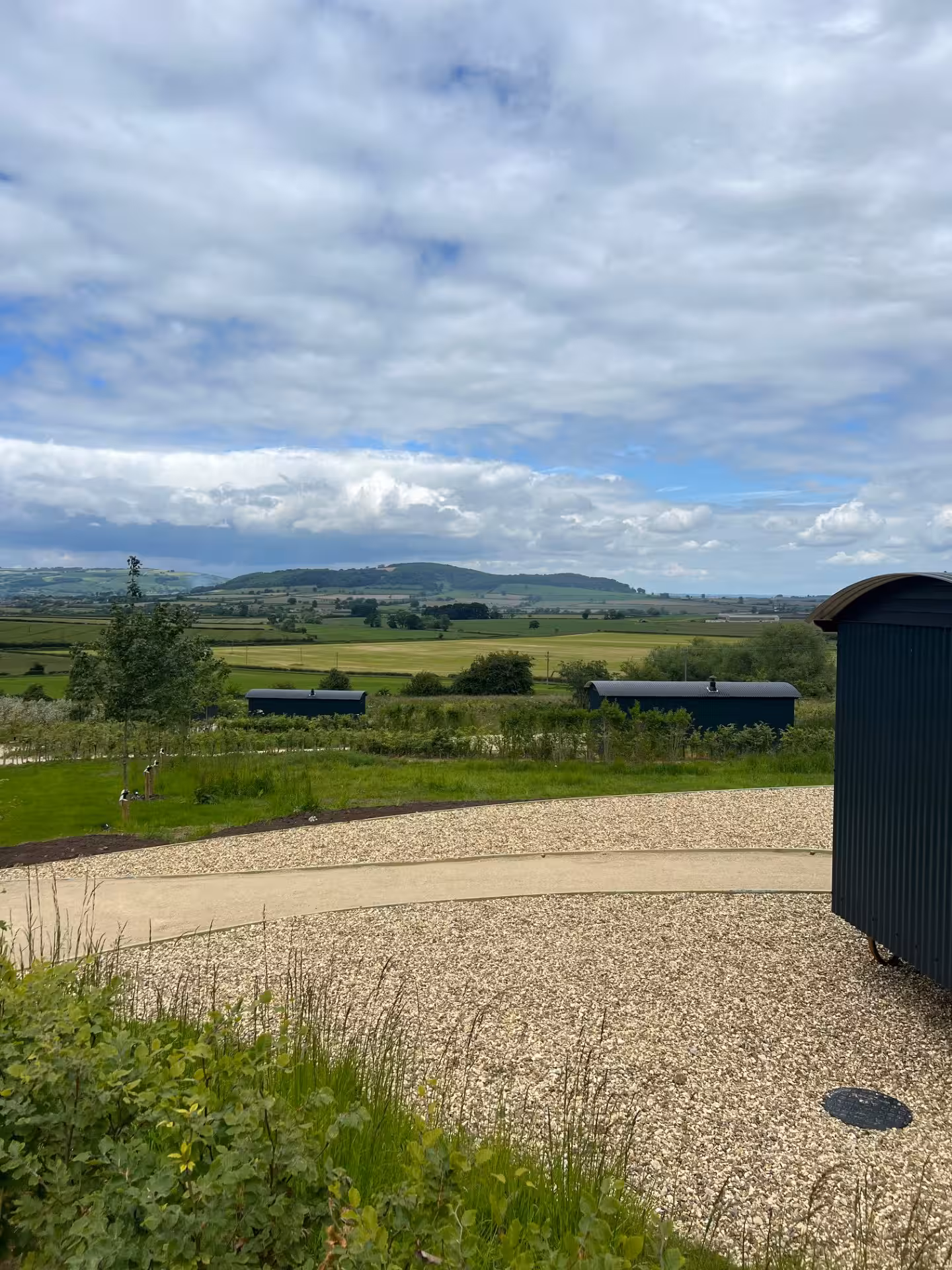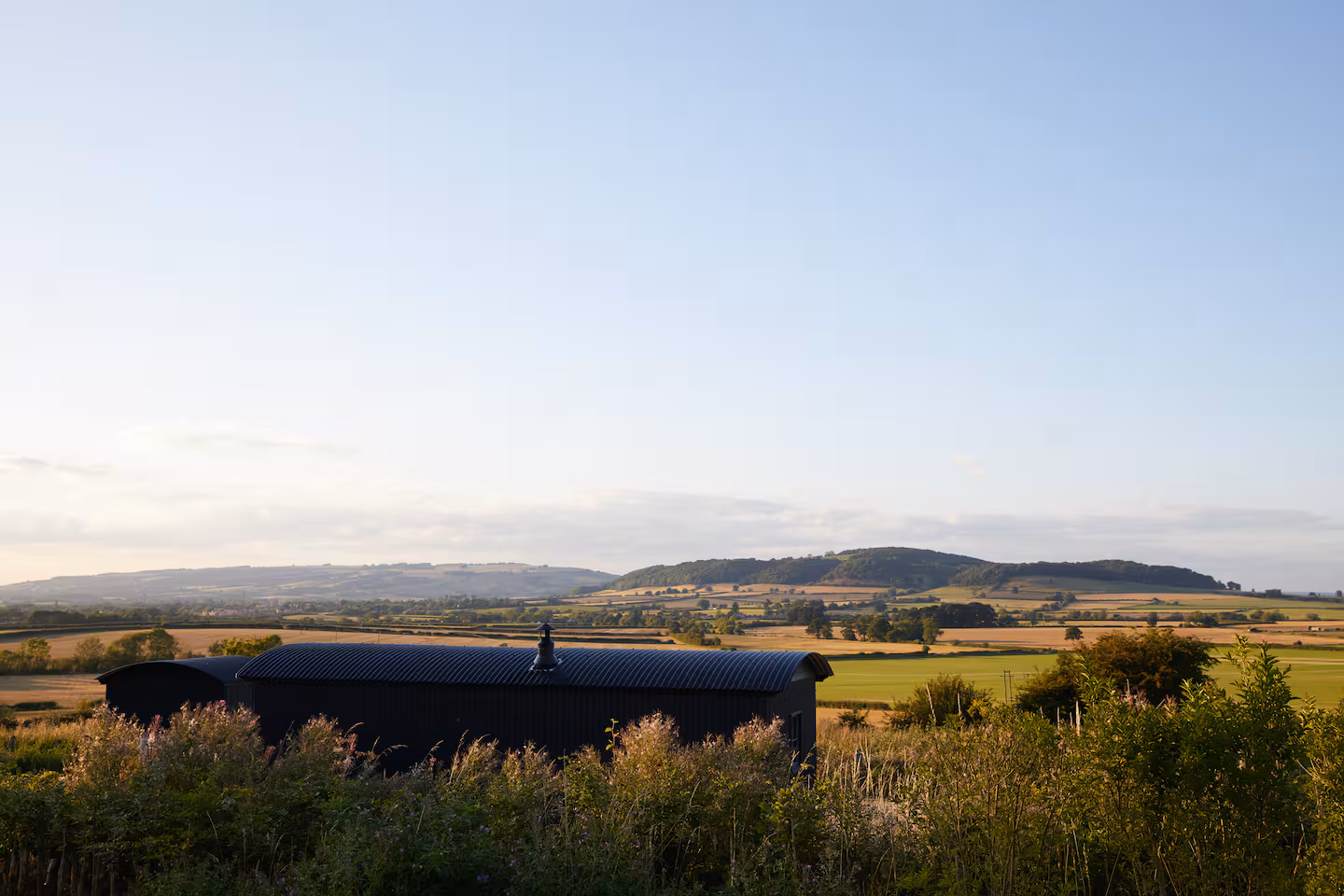 The hut opens onto its own piece of outdoor space within a private field shared by three huts, each positioned for privacy with native planting. The views stretch across the Vale of Evesham, shifting with the light from morning to dusk. Evenings gather around the firepit; mornings are quiet and still.