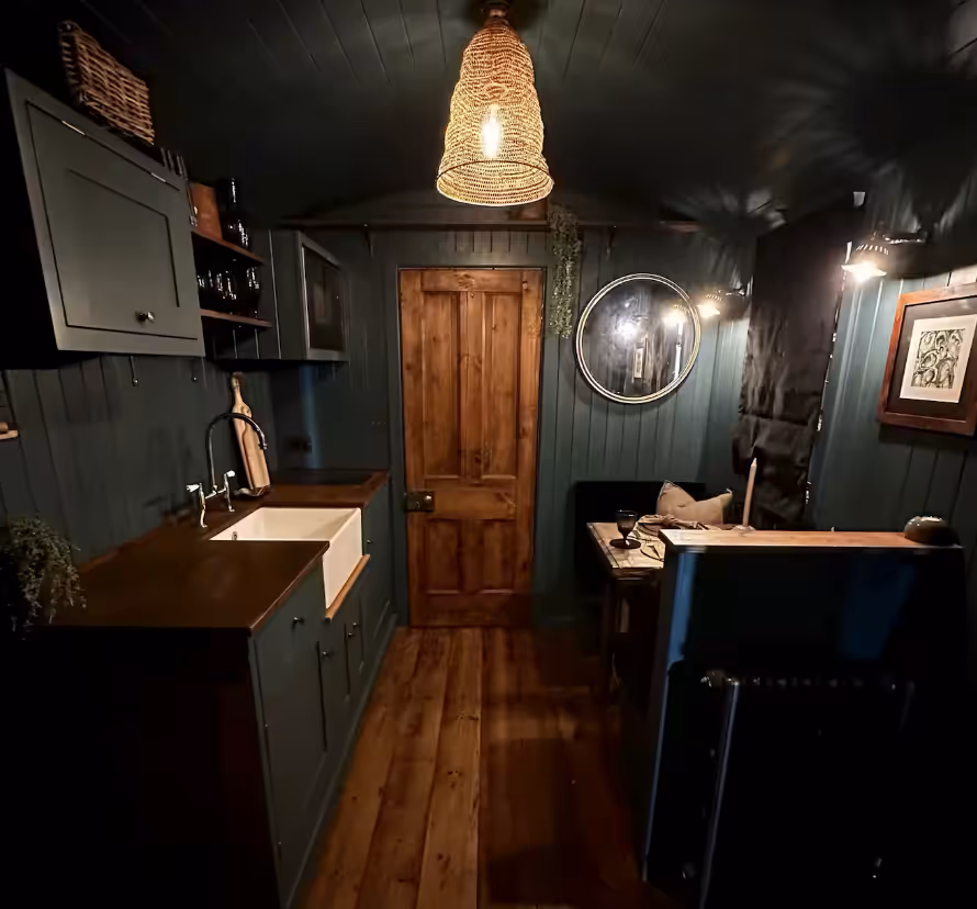 Bredon Shepherd Hut sits in the neighbouring field beside The Royal Oak and offers a warm, restful retreat shaped by soft textures and long views across the valley. Inside, a comfortable kingsize bed anchors the space, paired with a stylish shower room finished with Bert & May tiles and thoughtful touches.The central living area brings together a compact kitchenette with cast-iron cookware, Nkuku glassware and a Nespresso machine, alongside a dining nook for unhurried meals. A log burner gives the hut a gentle, steady warmth on cooler days, making it feel inviting throughout the year. The blend of industrial notes and contemporary softness creates a calm atmosphere designed for easy living.