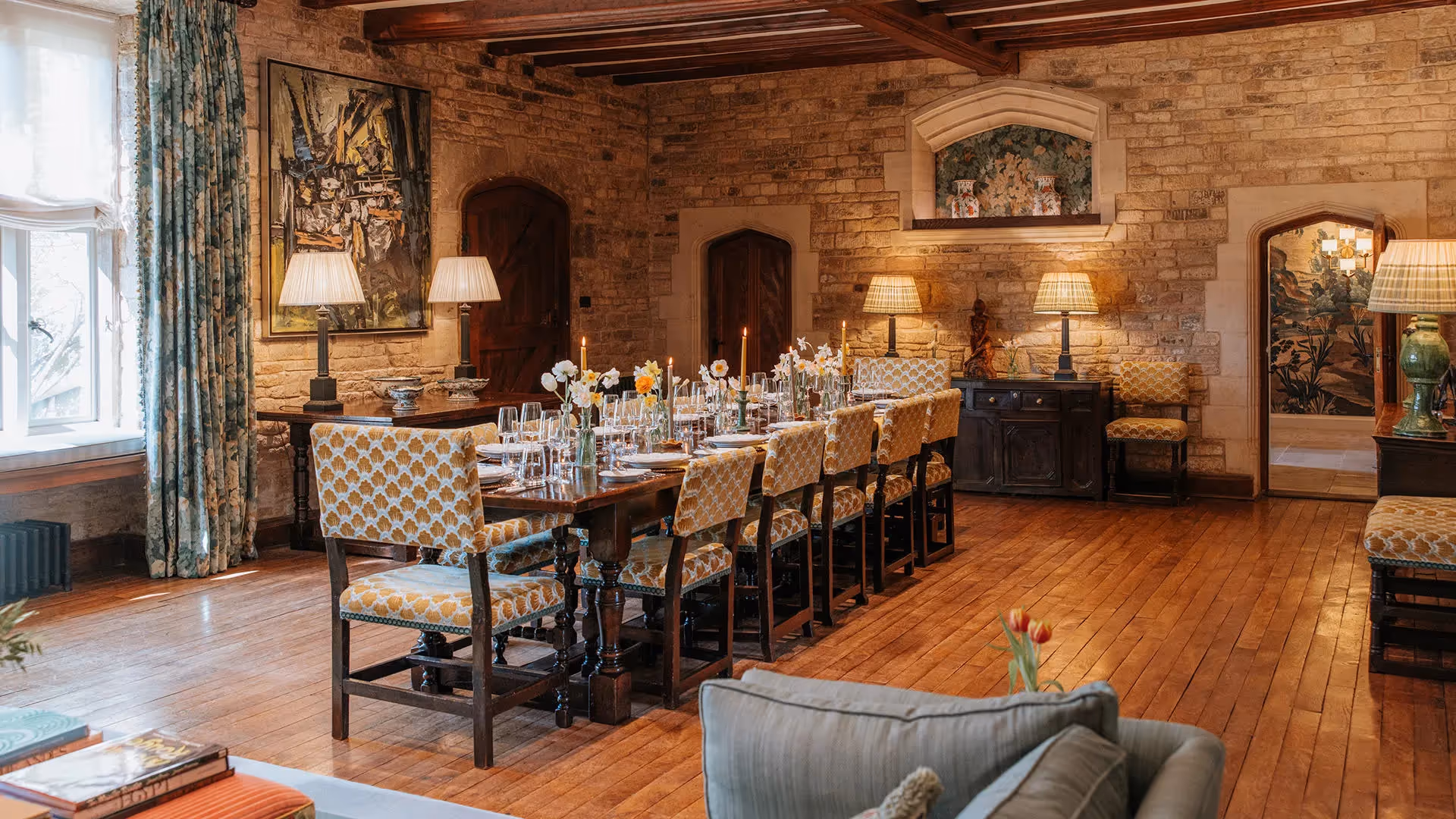 The house offers six reception rooms, providing generous and flexible entertaining space. A large sitting room and an elegant first-floor drawing room create refined areas for conversation and relaxation, while the medieval-style banquet hall seats up to twenty for formal dinners and celebratory gatherings. A dedicated club room and pool table add a more informal, sociable dimension.