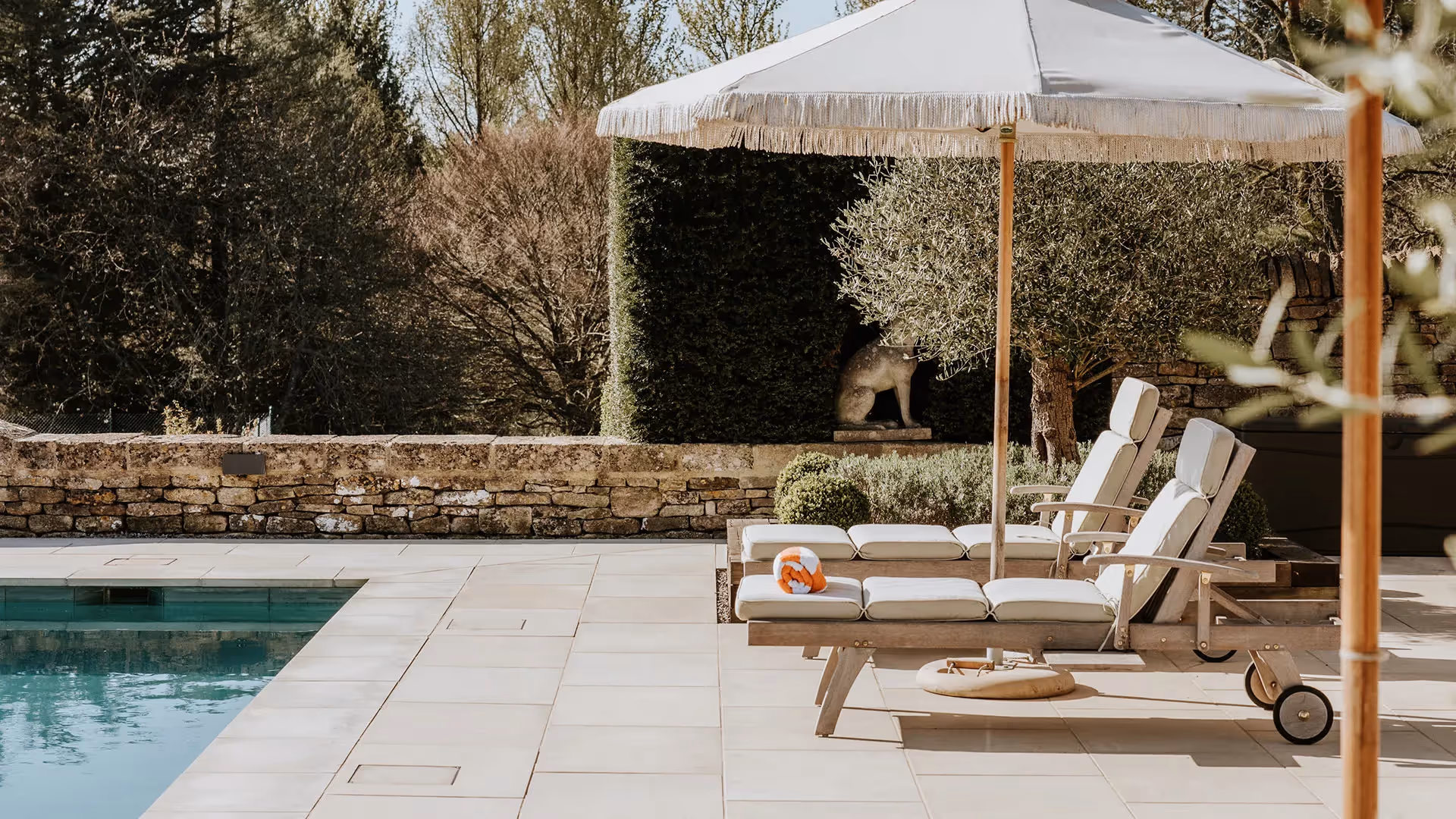 Leisure facilities include an outdoor swimming pool heated year-round, a pool house and spa, sauna, plunge pool and gym. The surrounding parkland and woodland provide privacy and a natural backdrop ideal for events, photography and extended stays.