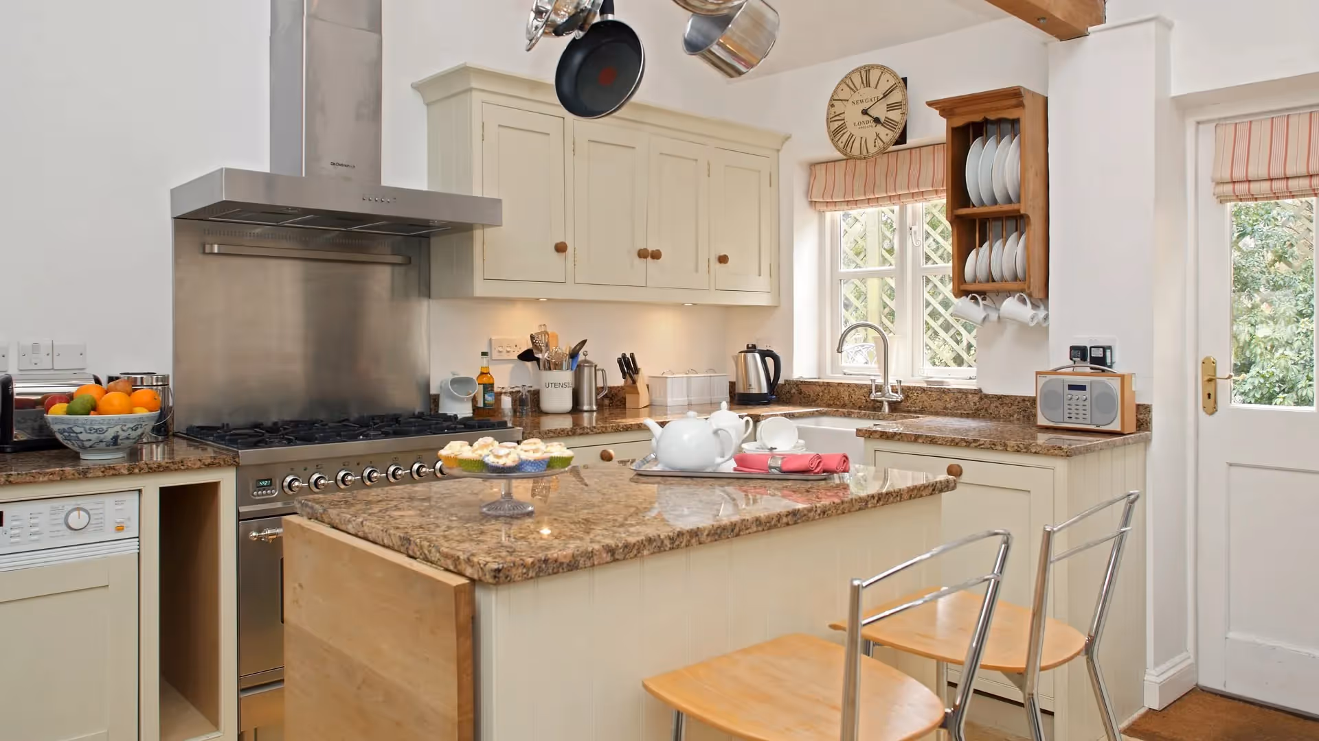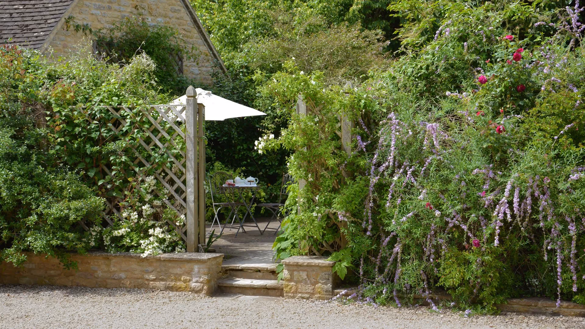 Small terraces to the east and west provide private outdoor seating, surrounded by trellis, clematis, roses and shrubs. Garden furniture, umbrella and barbecue allow for relaxed al fresco dining, while the wider Bruern estate offers access to the indoor heated pool, spa, gym, tennis court, games room and children’s play areas, all set within landscaped gardens along the River Evenlode.