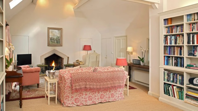 The heart of the cottage is the extraordinary 30-foot by 15-foot library, drawing and dining room. With its high pitched roof, tall proportions and dramatic Gothic stone fireplace, the space feels light and elegant — more chateau than cottage. Lined with hundreds of books, it offers a refined yet welcoming setting for quiet evenings or relaxed entertaining.
