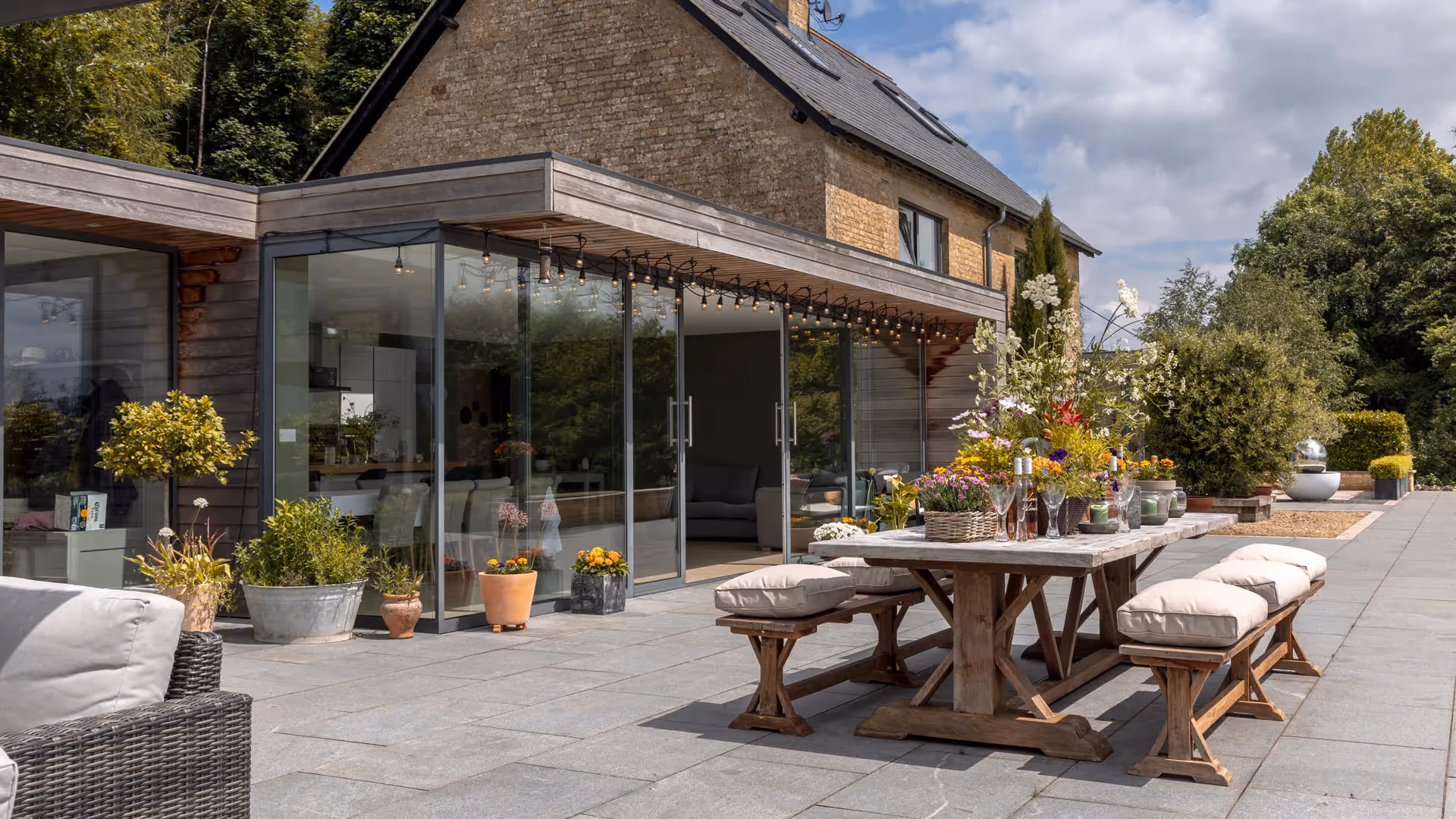 The house is arranged around a large kitchen that overlooks the dining area, where an extending table allows for flexible entertaining. The layout is open and sociable, designed for gathering family and friends with ease.