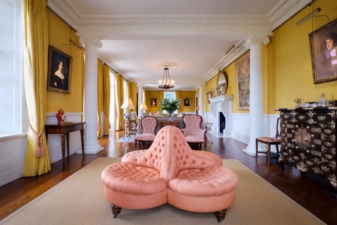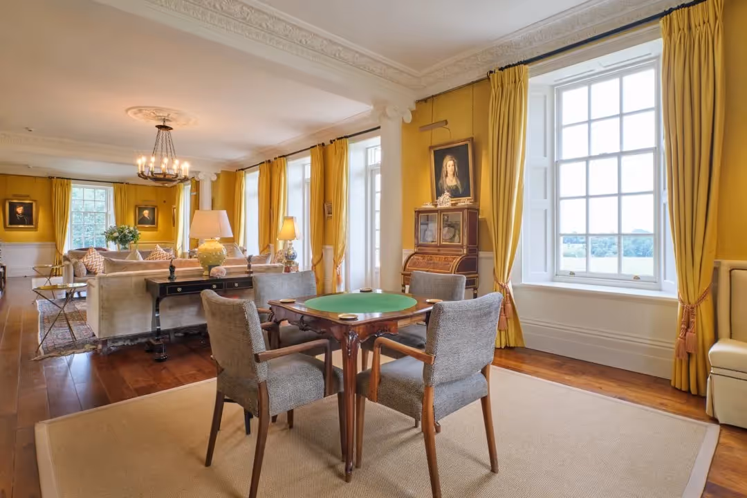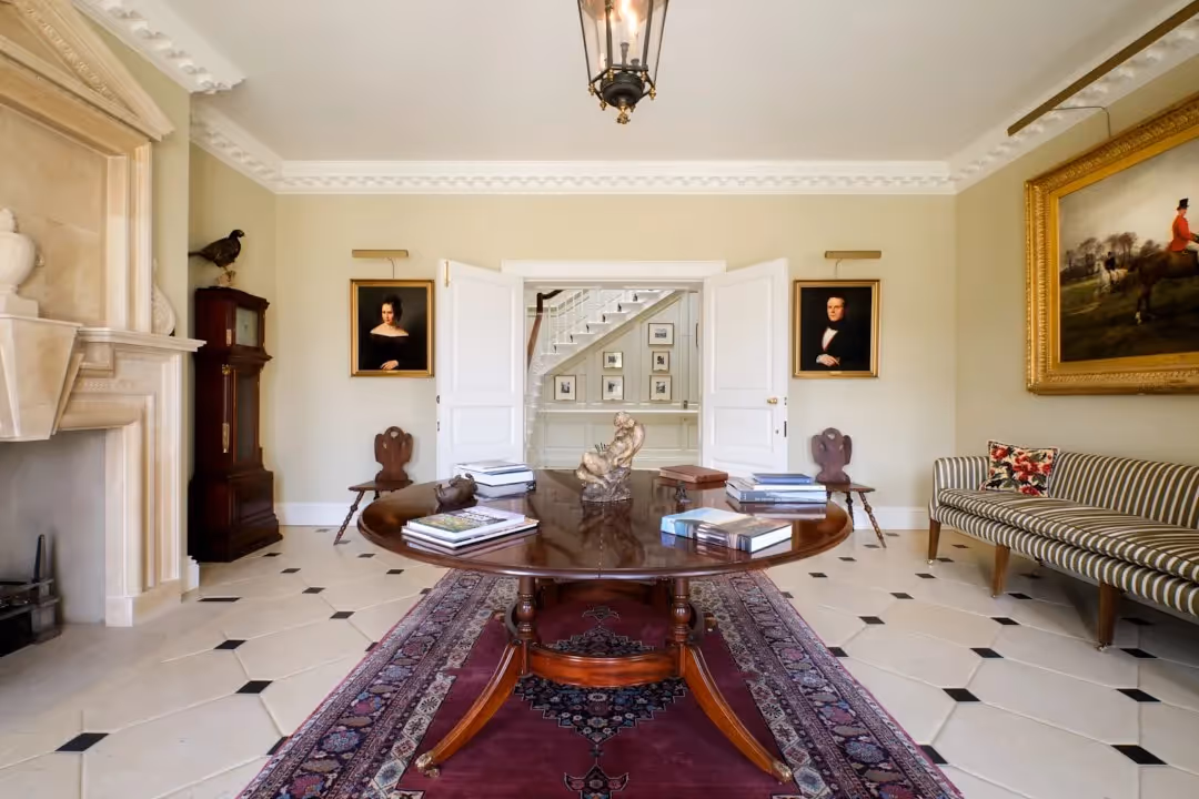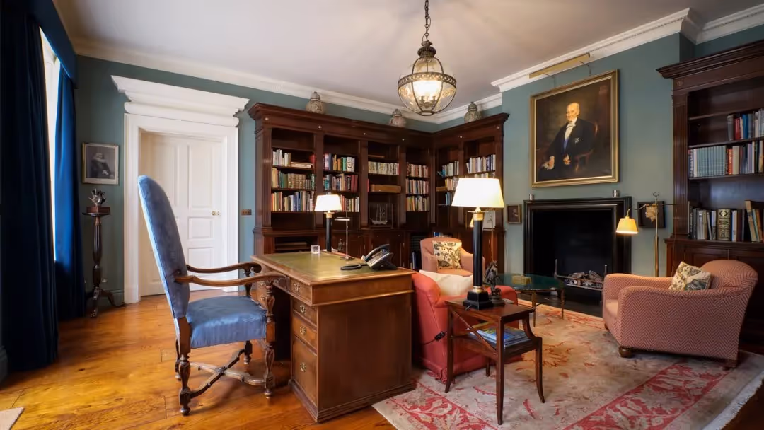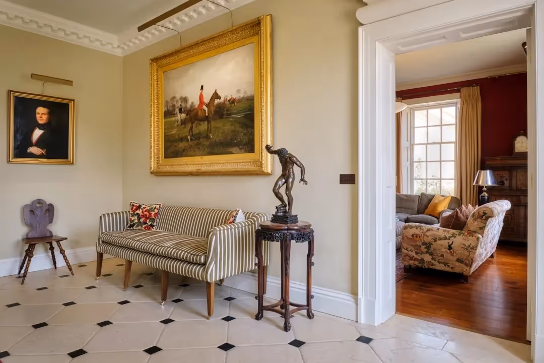 Internally, elegant proportions are complemented by considered detailing: marble and stone fireplaces, timber staircases, decorative plasterwork and bespoke mahogany bookcases. A painted timber-panelled dining room offers a striking setting for formal meals, while the drawing room, library and additional sitting room provide varied spaces for relaxation and entertaining.