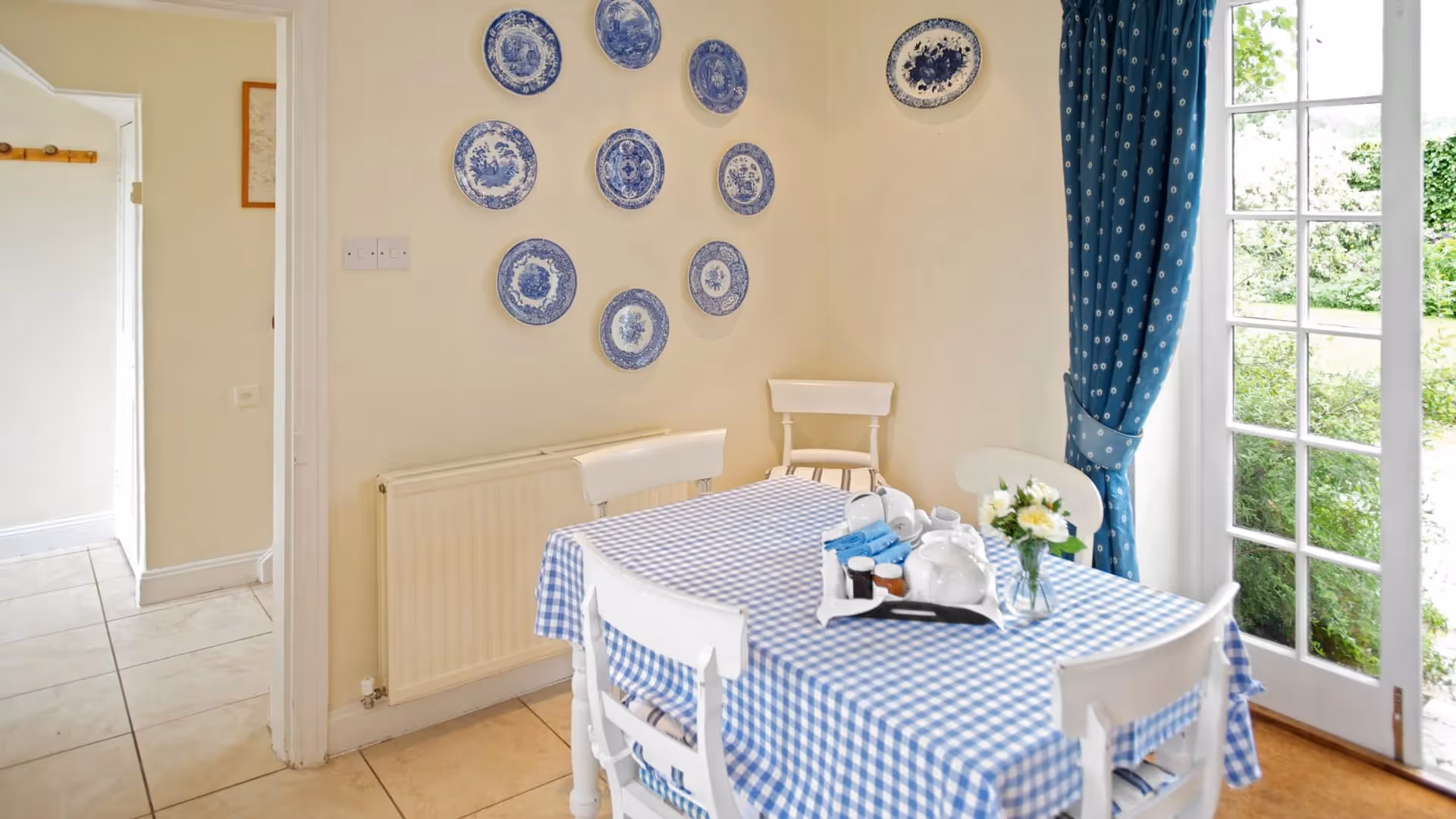 The heart of the cottage is a generous 19-foot square drawing and dining room, filled with light from windows on three sides and centred around an open fire. The atmosphere is classic country house — relaxed, warm and thoughtfully furnished.