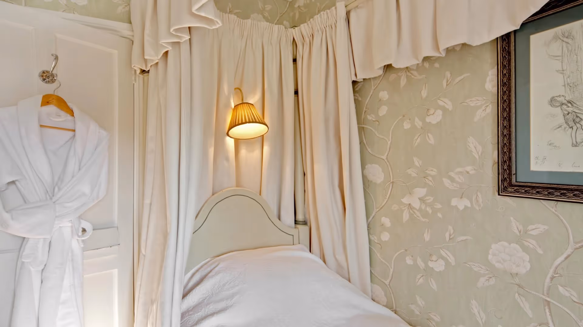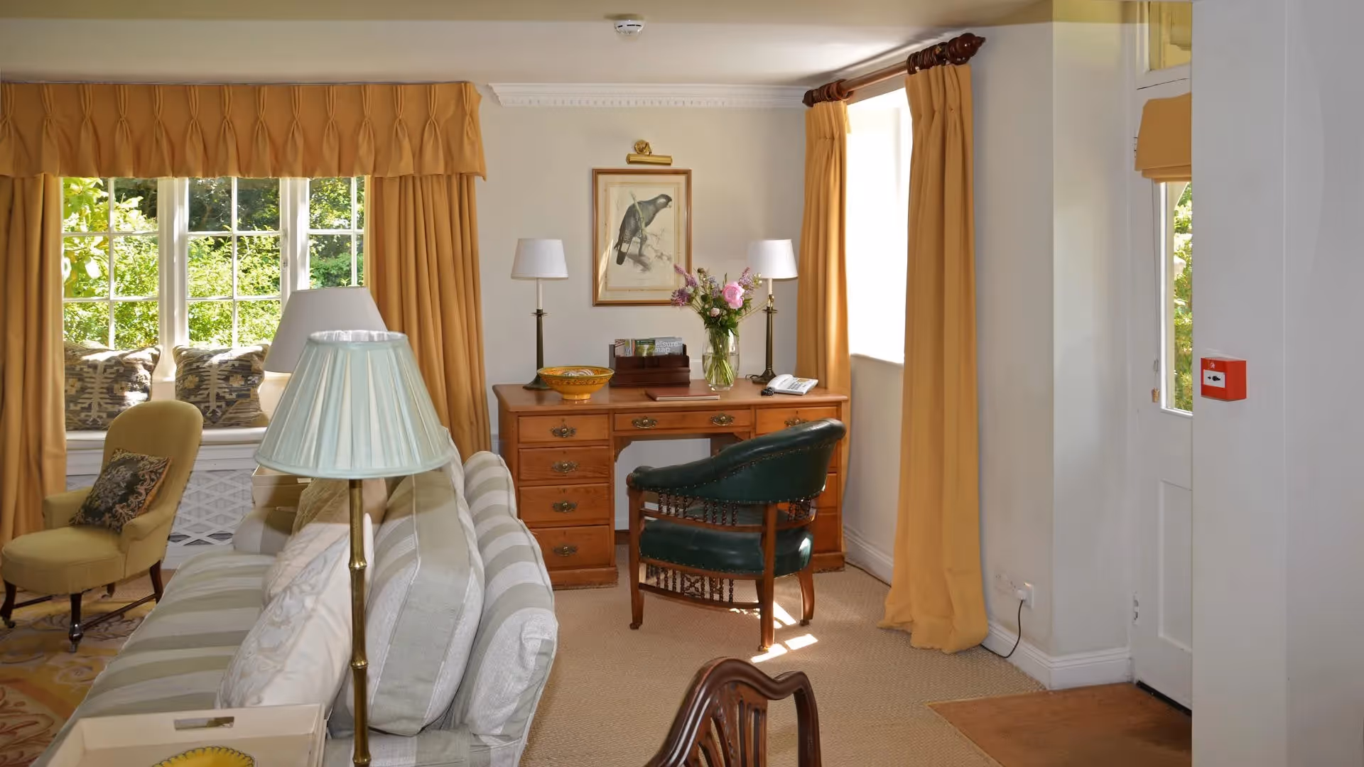 The private enclosed garden is one of Goodwood’s defining features. A lawn framed by yew hedges is bordered by yellow and cream roses, honeysuckle and lilies, with a romantic arbour providing a quiet spot to sit. Beyond the cottage, guests enjoy shared access to Bruern’s spa, indoor heated swimming pool, gym, tennis court, games room and children’s play areas.