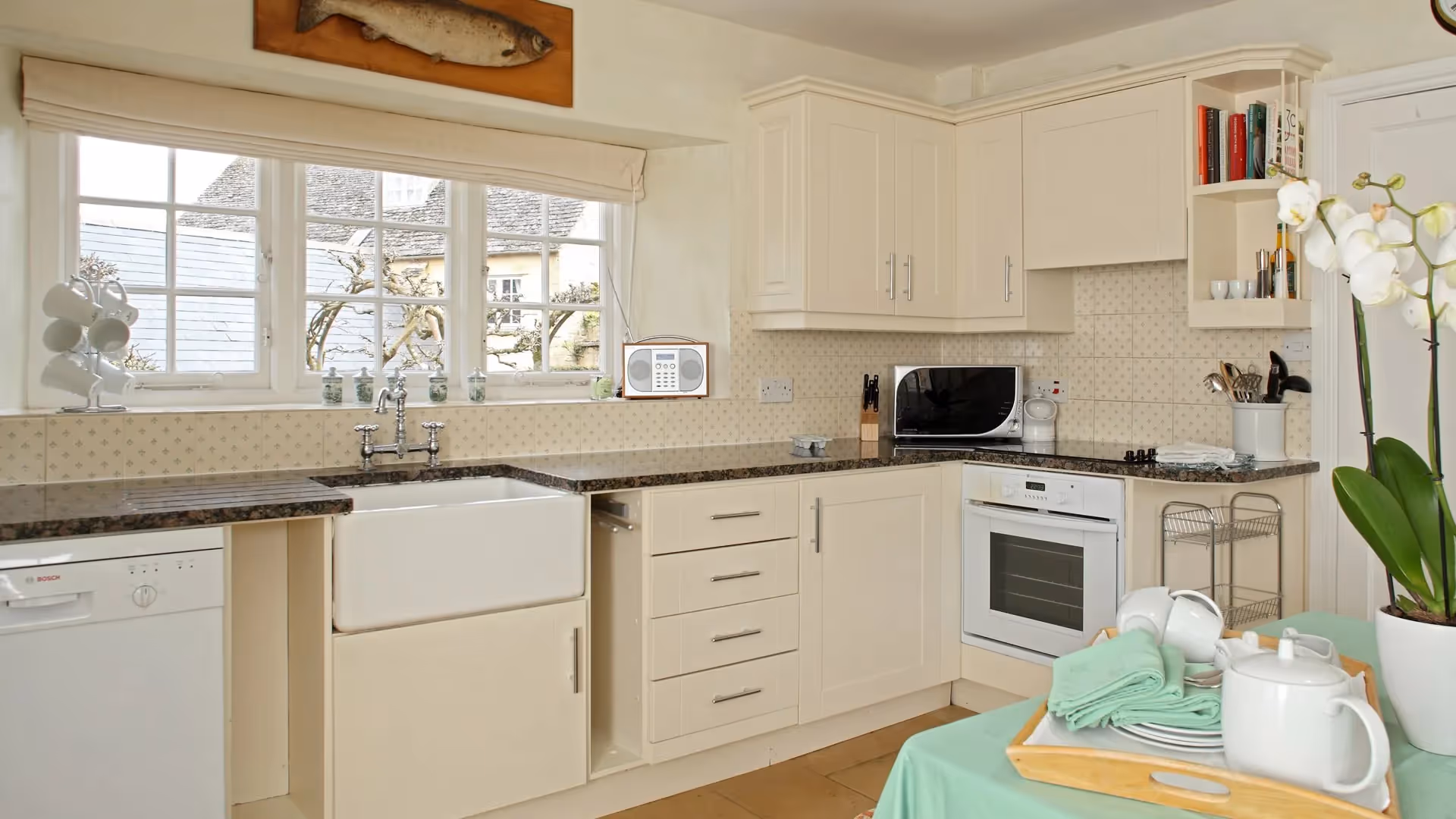 At the heart of the cottage is the 19-foot square drawing room and dining space, with windows on three sides and an open fire that creates a warm focal point. The fully equipped kitchen provides everything needed for relaxed self-catering.