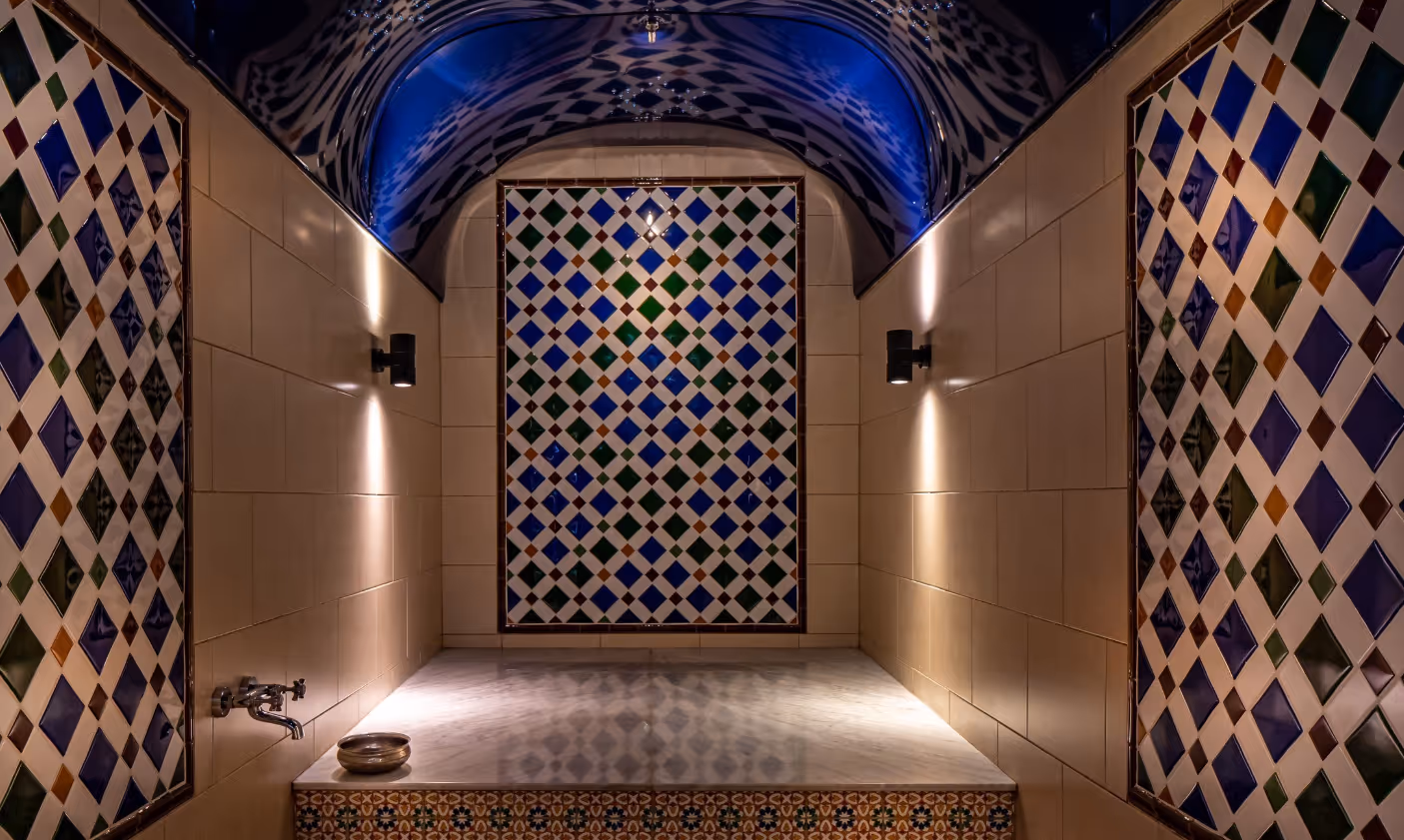 Guests enjoy access to exceptional shared facilities within Kingham Cottages: a heated indoor swimming pool, tennis court, and the distinctive Moorish Pavilion with its traditional hammam-style Turkish bath — ideal for unwinding after a day exploring the Cotswolds.