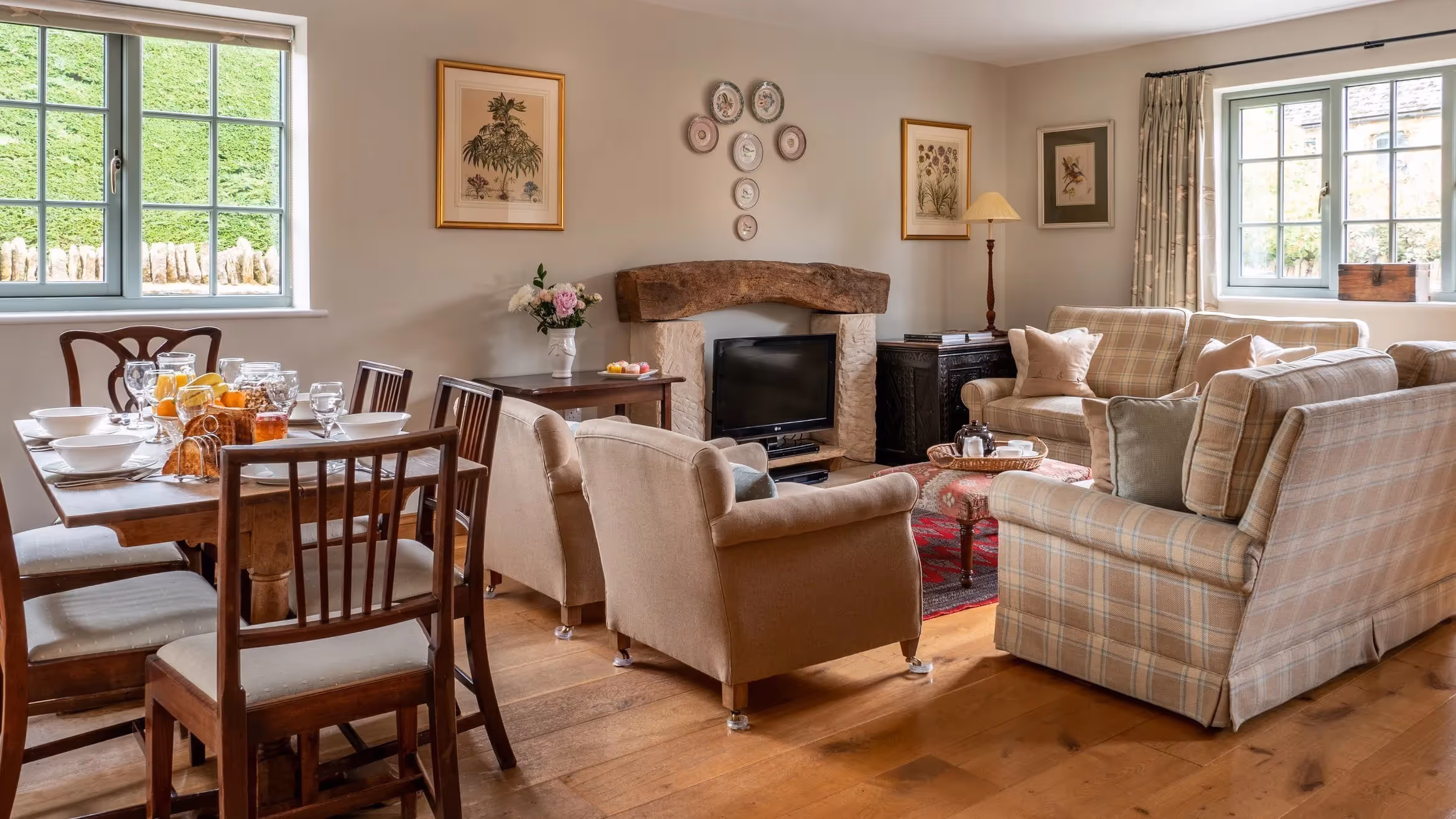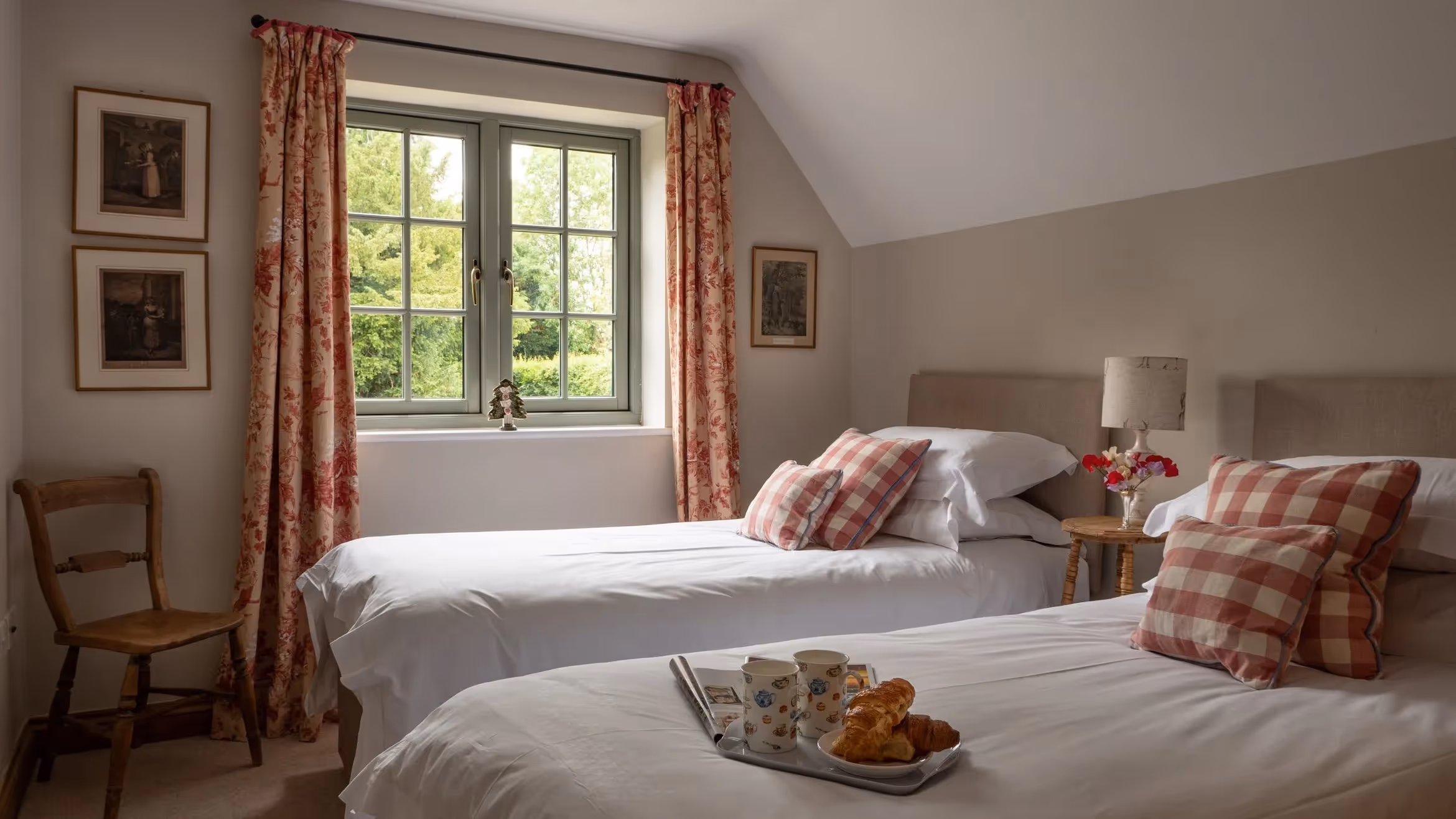 The top-floor twin bedroom is set beneath oak beams and enjoys far-reaching countryside views towards Daylesford. Throughout the cottage, furnishings are simple and comfortable, with crisp linens and understated detailing.