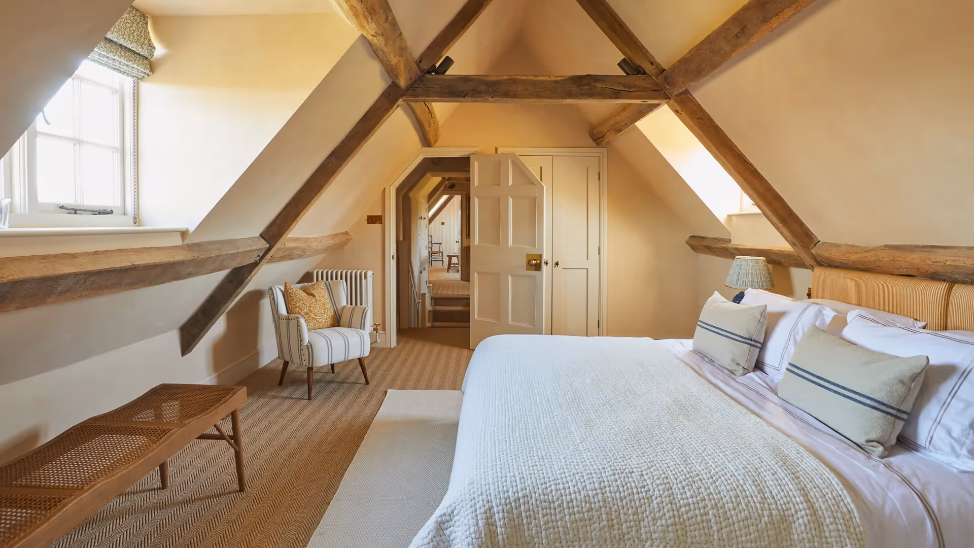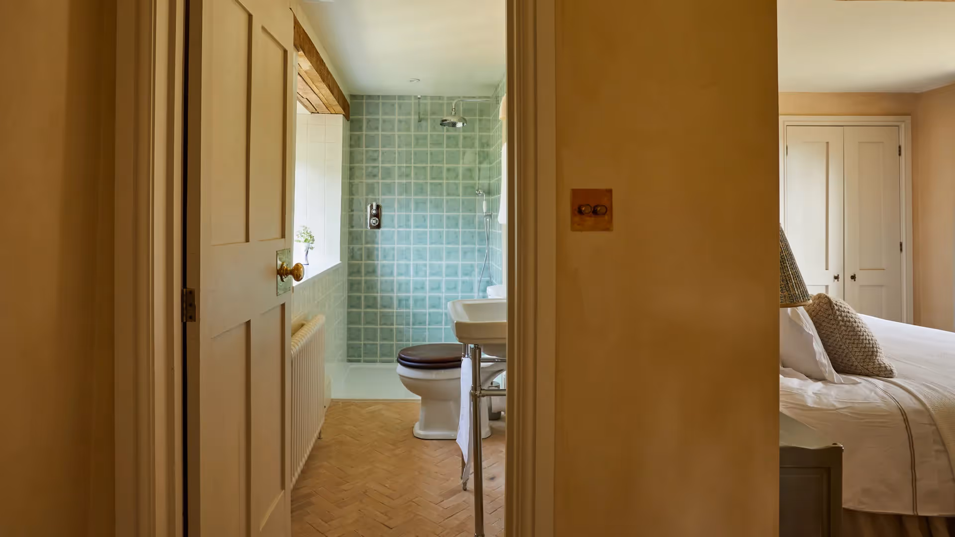 Ten bedrooms are distributed across the buildings, each with its own en-suite bathroom. Interiors combine soft palettes, natural materials and bespoke detailing, creating a cohesive feel throughout.