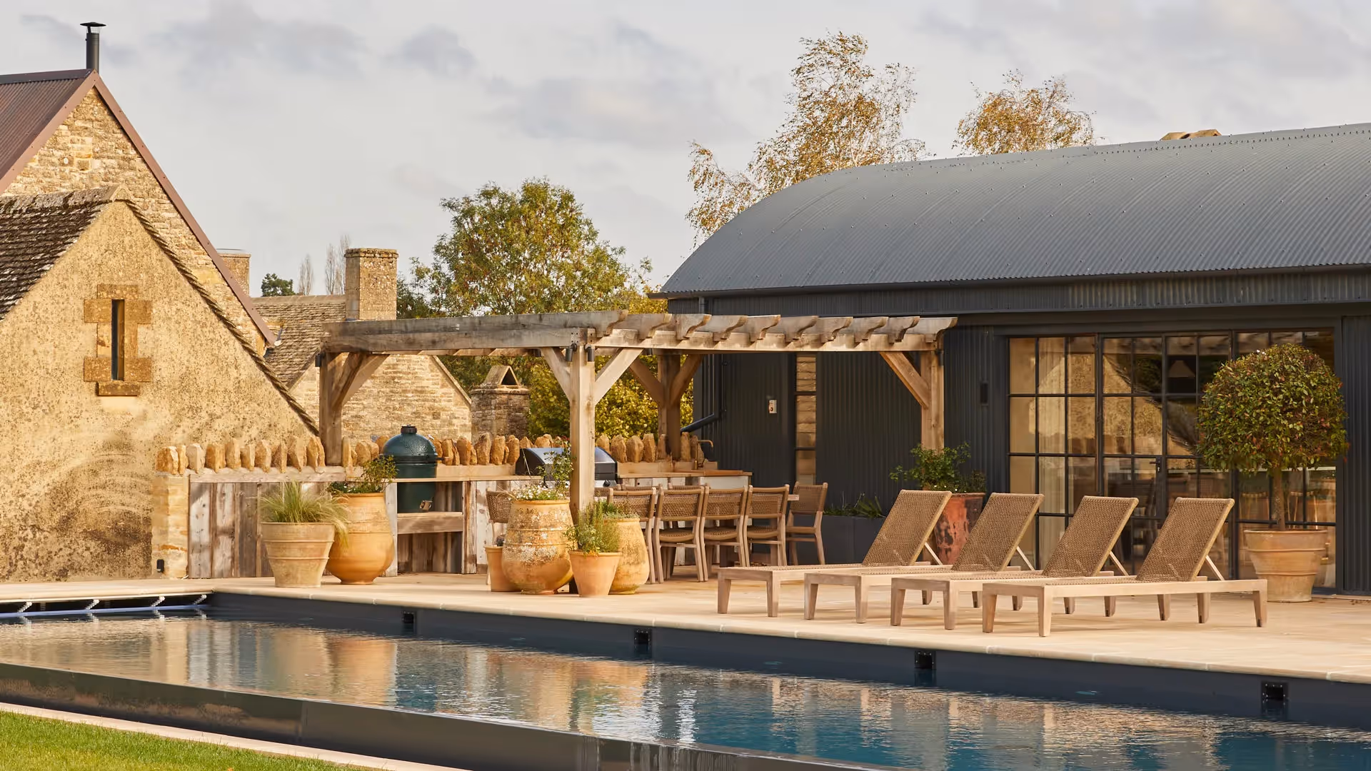 The Dutch Barn terrace overlooks the pool area, making it an ideal setting for shared meals, summer gatherings and relaxed evenings outdoors. The grounds allow space for children to roam, games to unfold and guests to move easily between buildings.