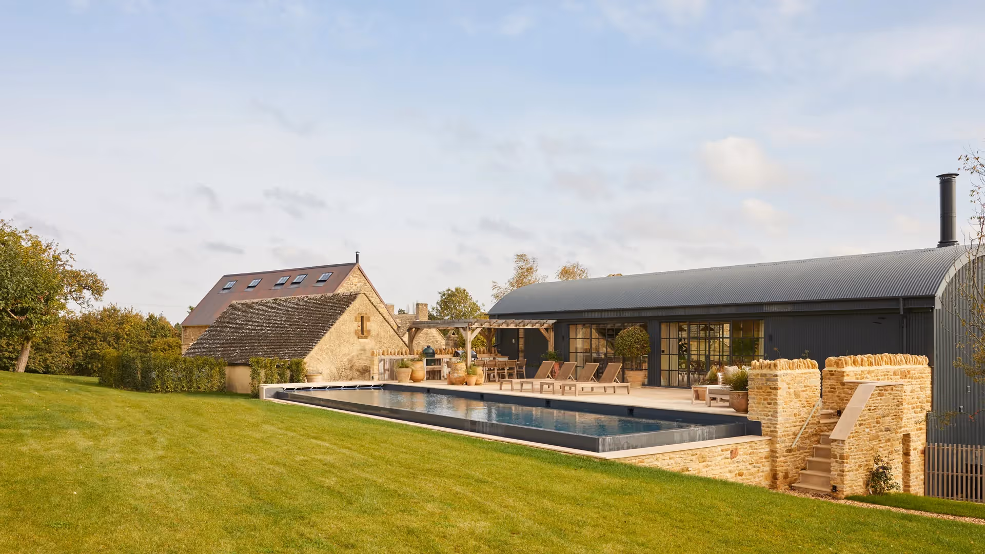 Latimer Farmhouse & Cottage offers exclusive use of the 19th-century listed Farmhouse and adjacent self-contained Cottage, set within seven acres of gardens and orchard with access to the Dutch Entertainment Barn, seasonal heated pool, tennis court, gym and sauna — a private and expansive North Cotswolds retreat for up to 16 guests.