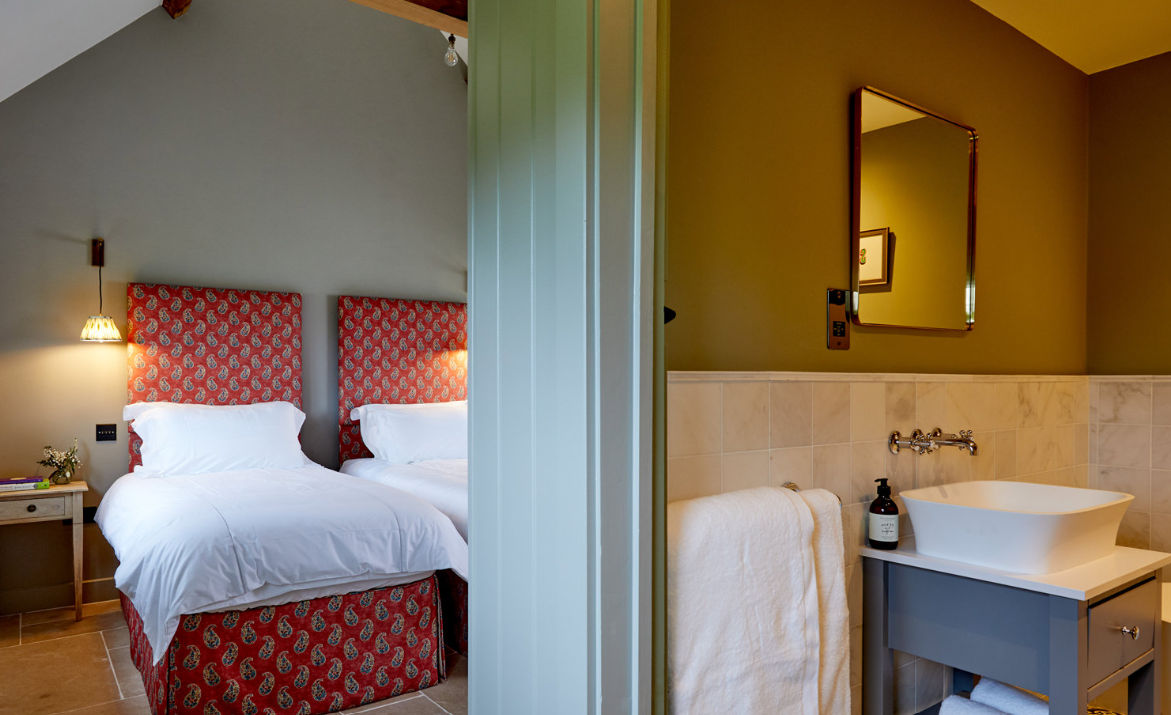 The Milking Parlour at Ampneyfield Barns is a beautifully designed single-level conversion with panoramic orchard views. Sleeping four across two en-suite bedrooms, it combines vaulted ceilings, soft tones, and contemporary comfort — a calm, elegant base for exploring the Cotswolds.