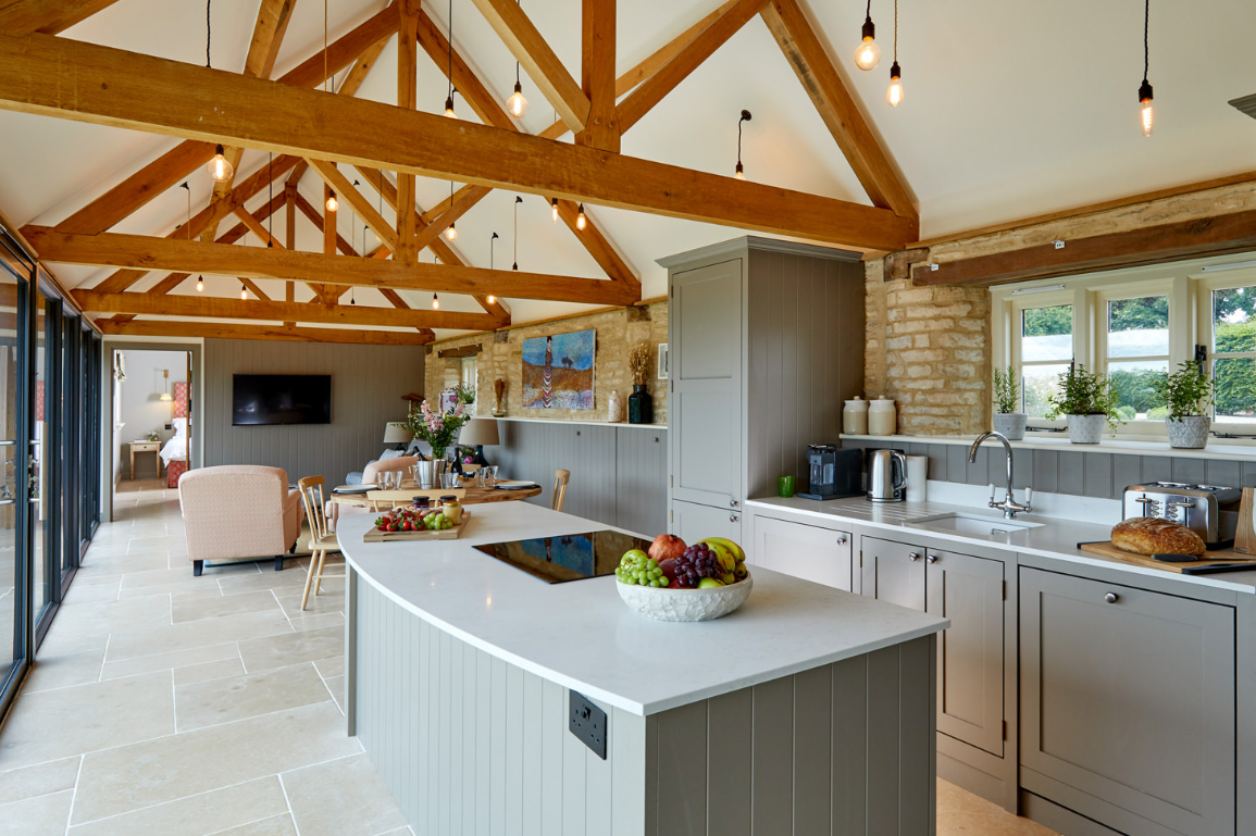 The Milking Parlour at Ampneyfield Barns offers 1,050 square feet of refined rural living, designed for comfort and ease. The open-plan layout brings together a vaulted-ceiling living area, dining space and fully equipped kitchen, all bathed in natural light from floor-to-ceiling windows that frame orchard and countryside views.