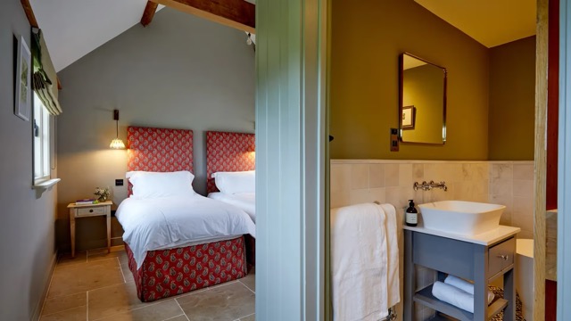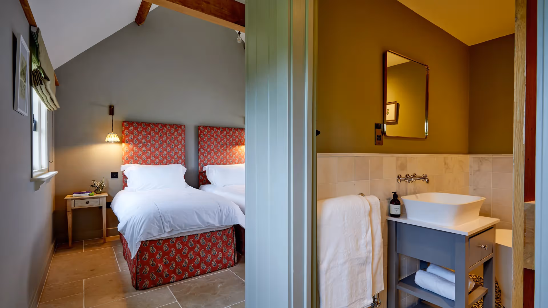 The sleeping barn contains two en-suite bedrooms: a king-size bedroom with en-suite bathroom and twin basins, and a zip-and-link king bedroom with en-suite shower room, offering flexibility for couples or friends travelling together.