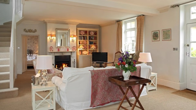 The heart of the cottage is a large open-plan space combining drawing room, dining area and fully equipped kitchen. An open fire creates a warm focal point, while generous proportions make it ideal for family gatherings or shared meals.