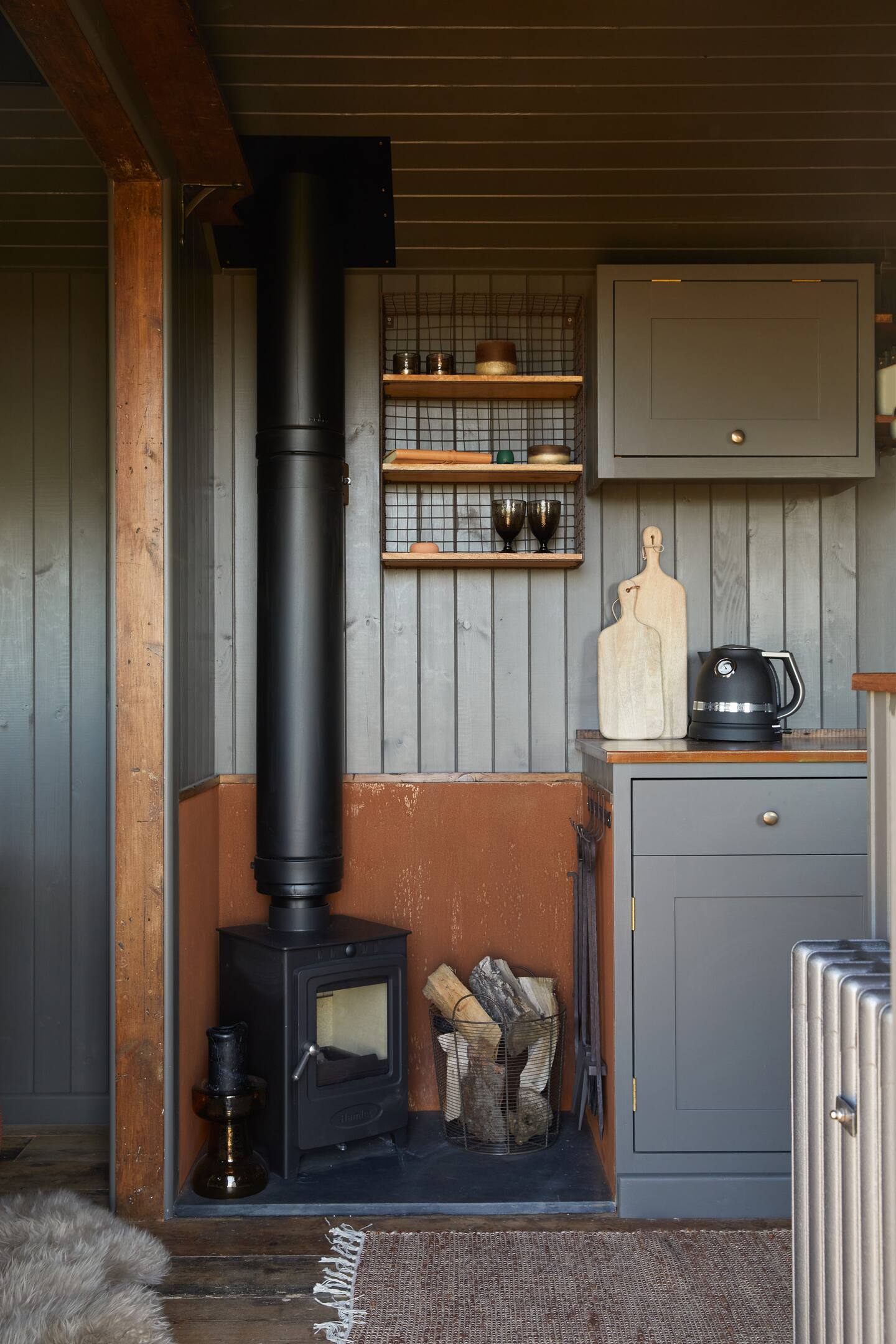 The central living area includes a compact kitchenette with cast-iron cookware and a Nespresso machine, alongside a dining nook for unhurried meals. A log burner anchors the room on cooler days, giving the hut a sense of warmth and ease that suits slow mornings and long evenings alike.