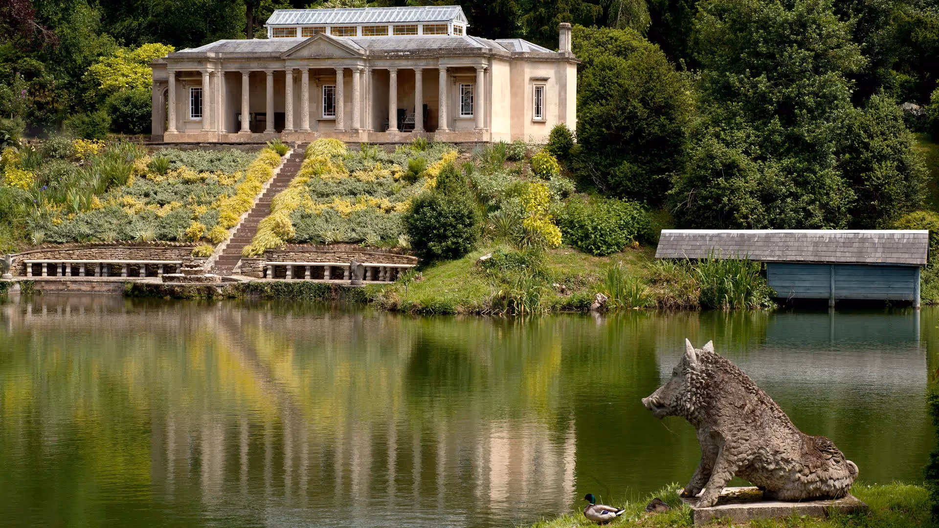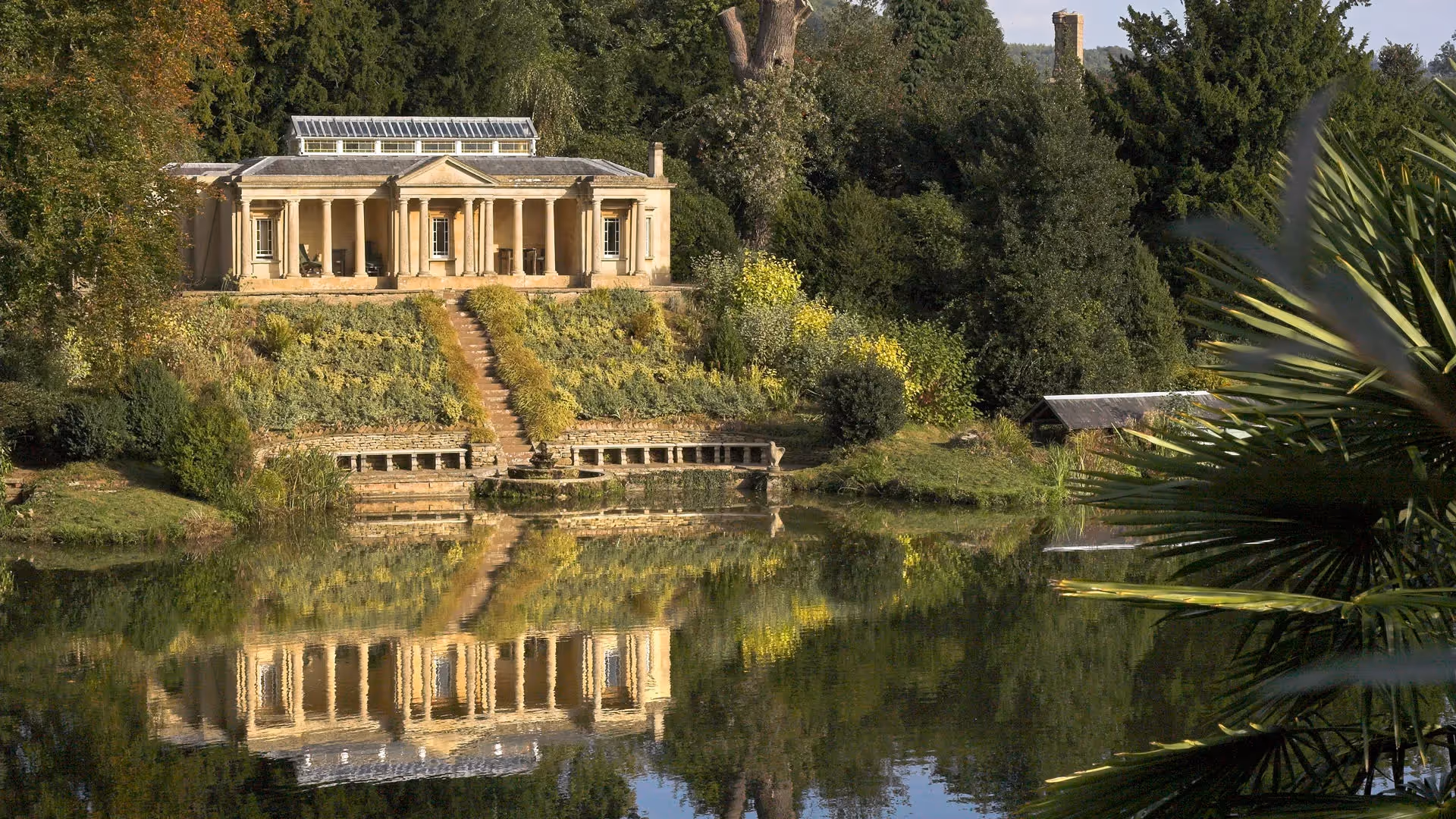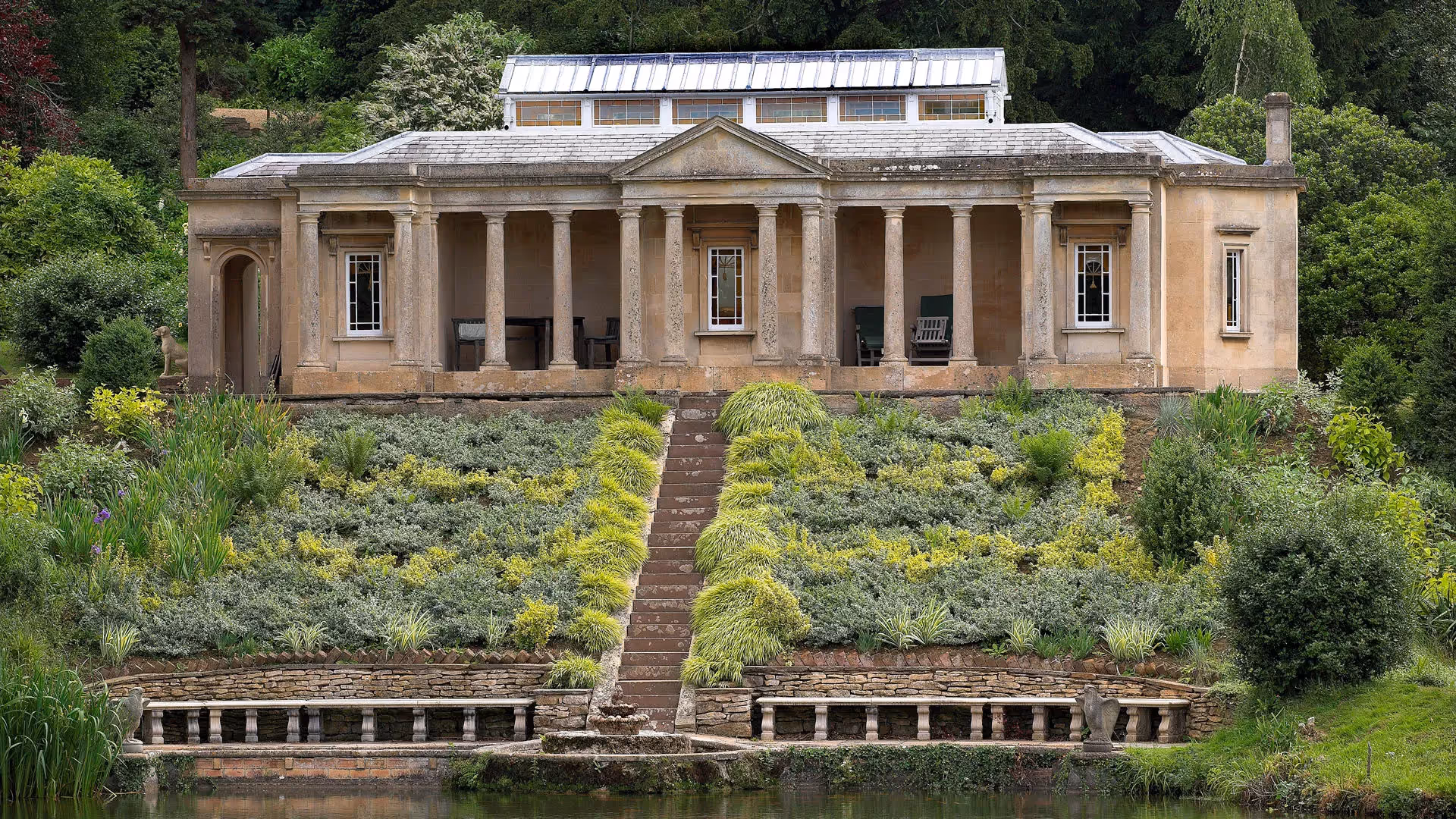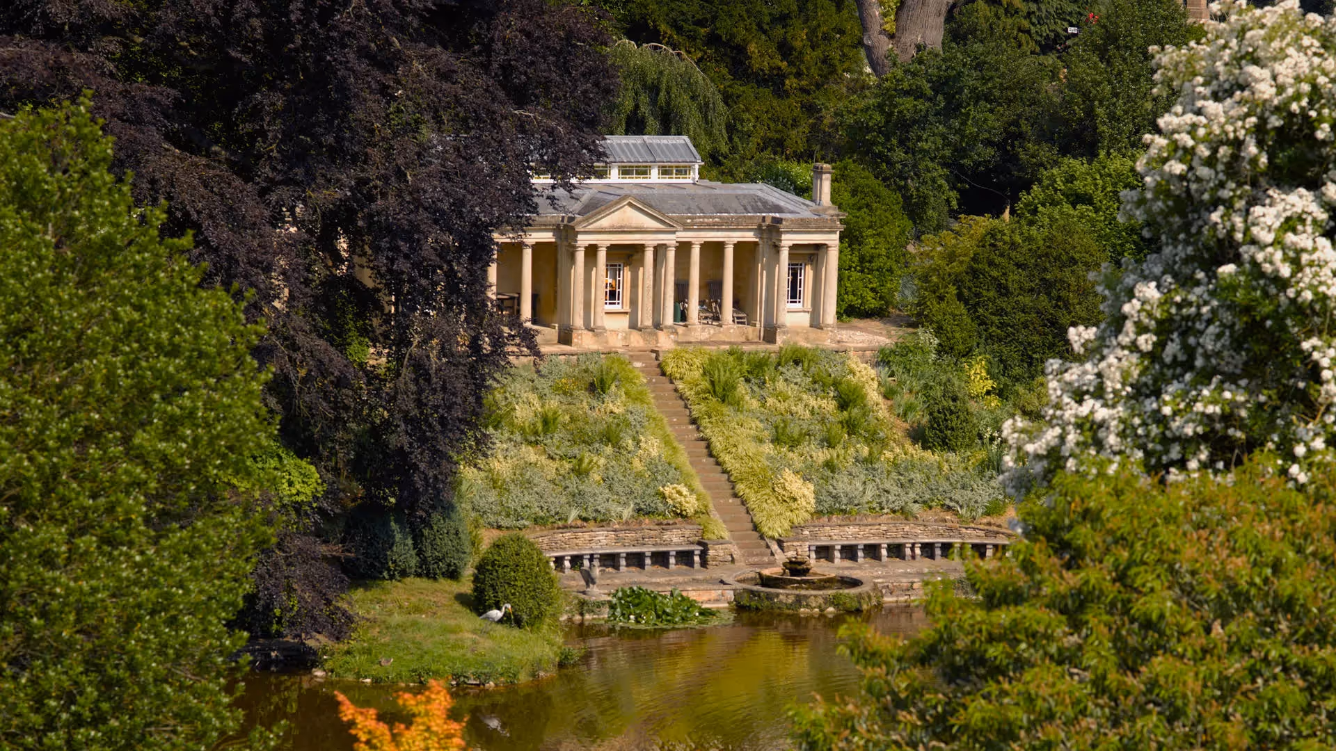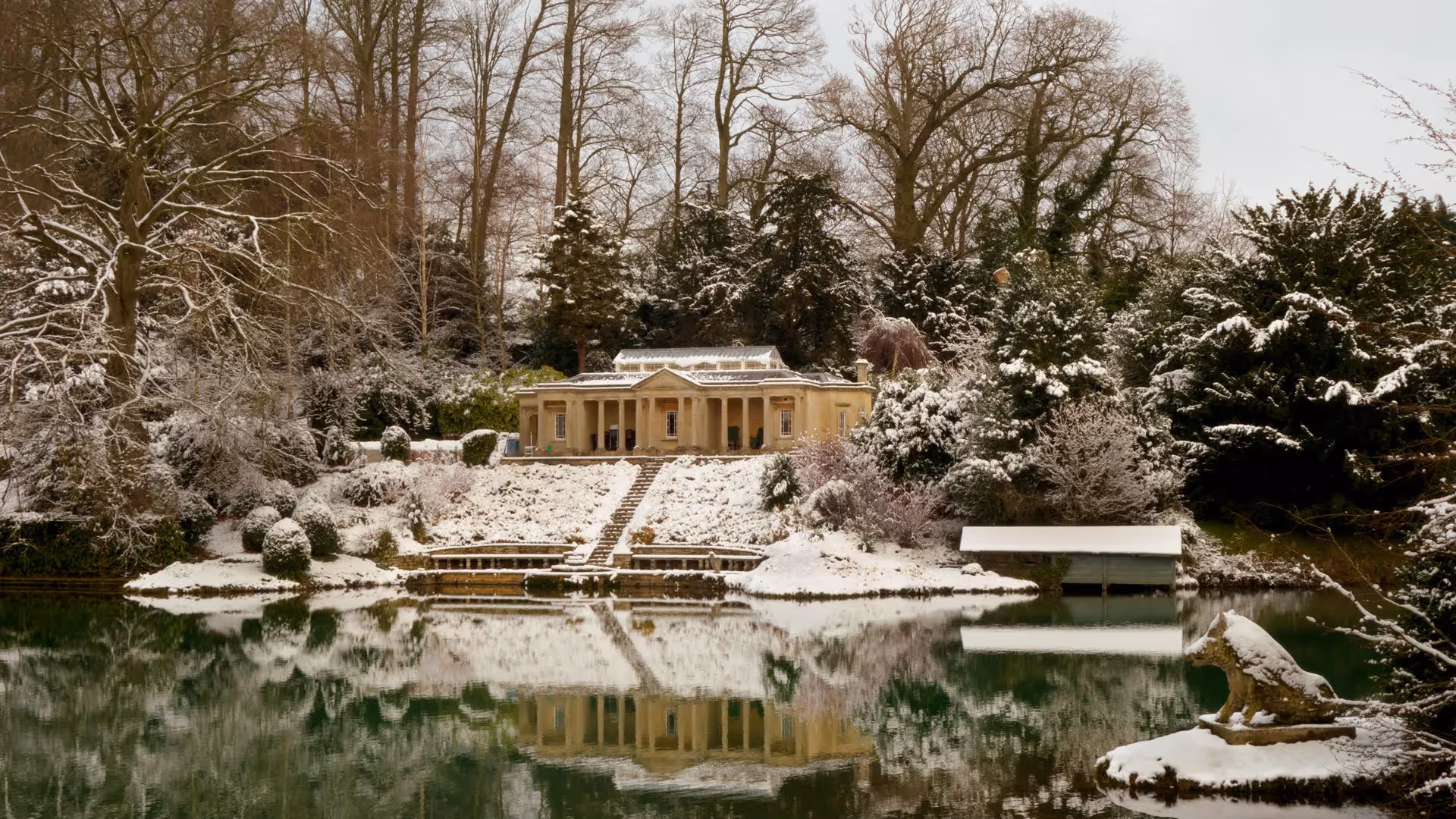 A secluded 19th-century Doric temple overlooking a private lake within the Grade I listed grounds of Stancombe Park — an intimate, elegant hideaway for two with complete privacy, modern comforts and a uniquely romantic atmosphere.