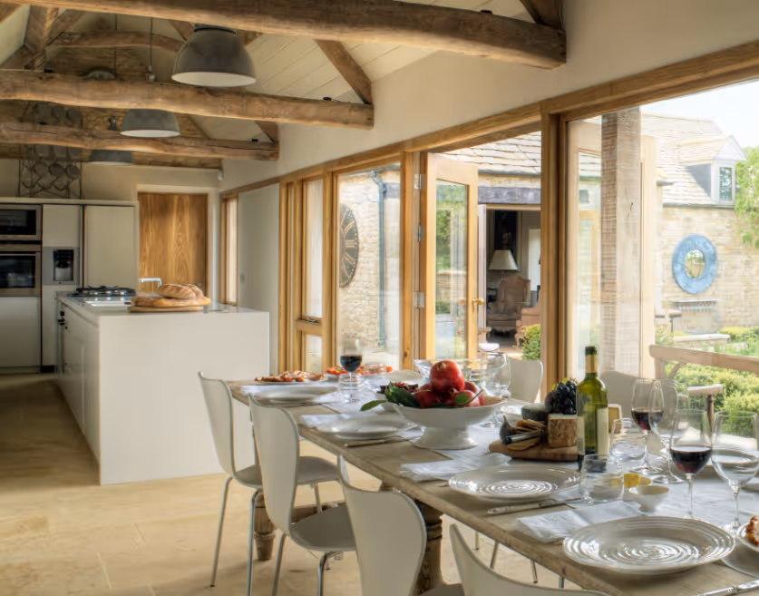 The Barn is a contemporary self-catering barn conversion with six luxurious ensuite bedrooms sleeping 12 to 14 guests; with its five themed suites, which includes the elegant Gold bedroom, exotic African bedroom and feminine Pink bedroom, the barn blends contemporary style and amenities with traditional Cotswold charm. The Barn is now paired with the Peacock Shed where the sixth en-suite bedroom is located and can be further paired with the nearby Cow Byre; or rented as the entire estate, ideal for very special occasions, weddings and corporate retreats.