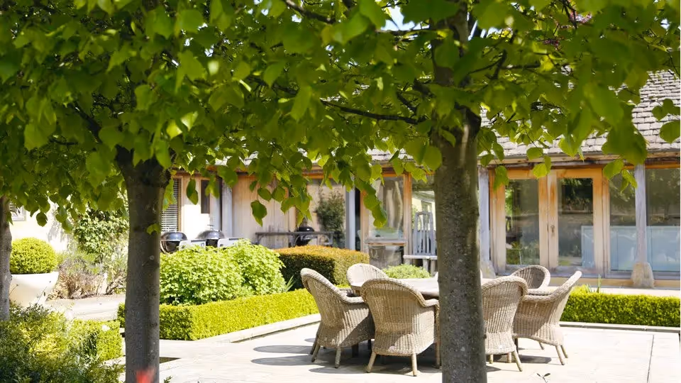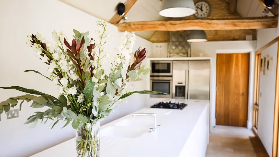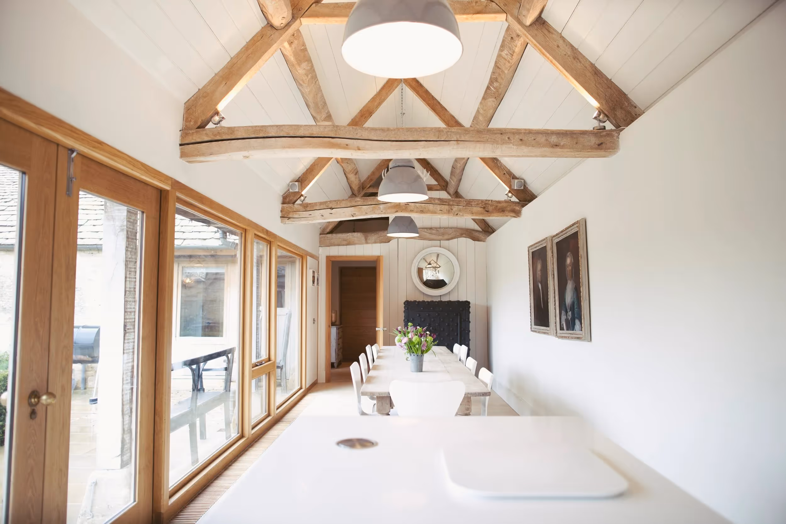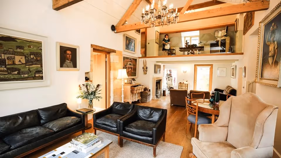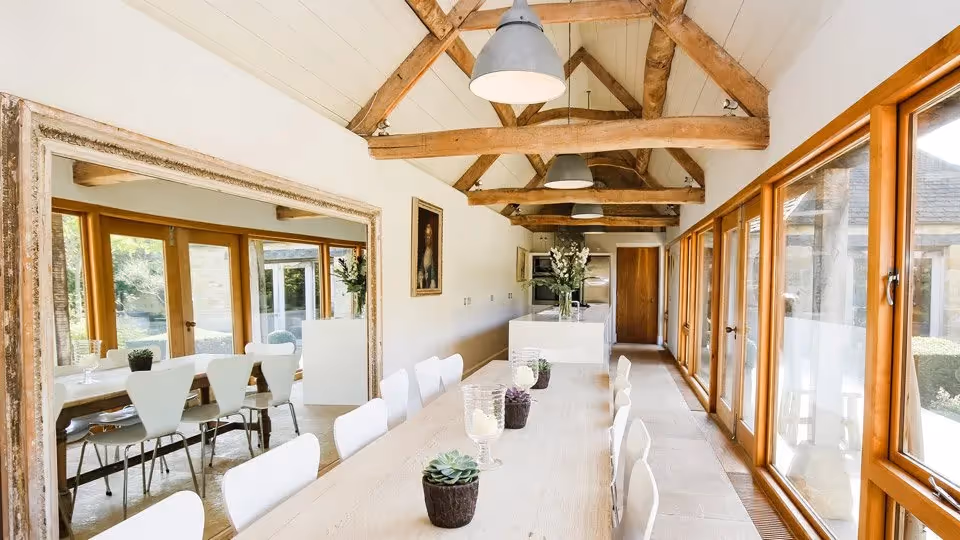 A warm, design-led barn conversion with real presence — vaulted ceilings, generous shared spaces, and six en-suite bedrooms split between the Barn and the Peacock Shed for a little extra flexibility. Days here naturally revolve around the water garden, the pool in warmer months, and long, lazy meals back at the kitchen table.