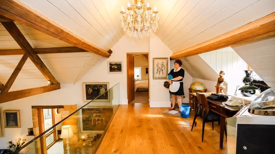 The Barn is set up for easy group living. A vaulted drawing room makes a brilliant main space for fireside evenings, with a gallery study above for anyone who wants a quieter corner. The kitchen–dining room is the heart of the house, fully equipped and made for cooking together, with doors opening straight out towards the water garden.