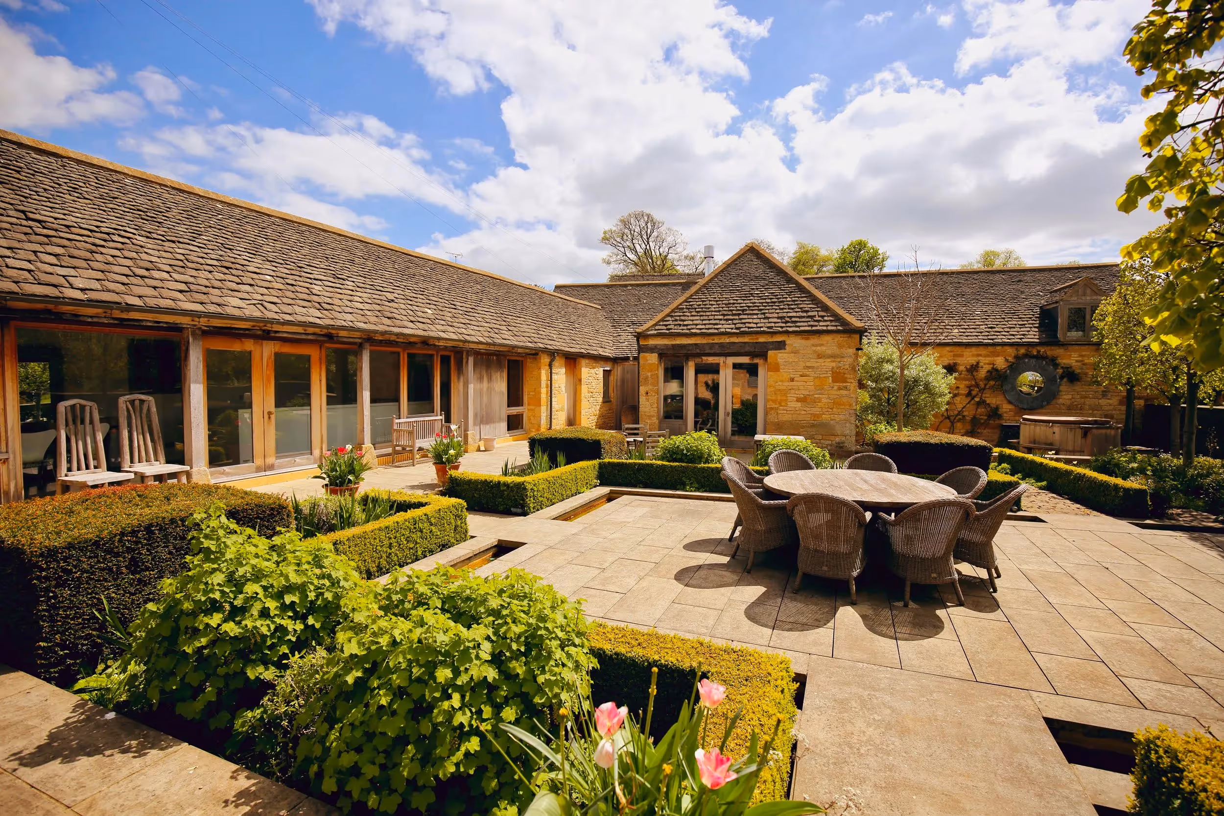 You have exclusive use of the seasonal heated pool from April to October, set within the enclosed Peacock Garden. The hot tub sits in the private patio garden for slow evenings under the stars. The water garden brings a calm, tucked-away feel, with space for outdoor dining and unhurried afternoons.