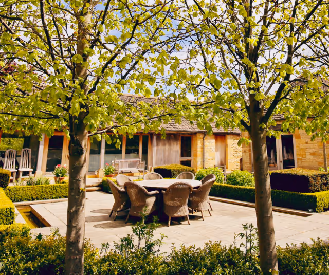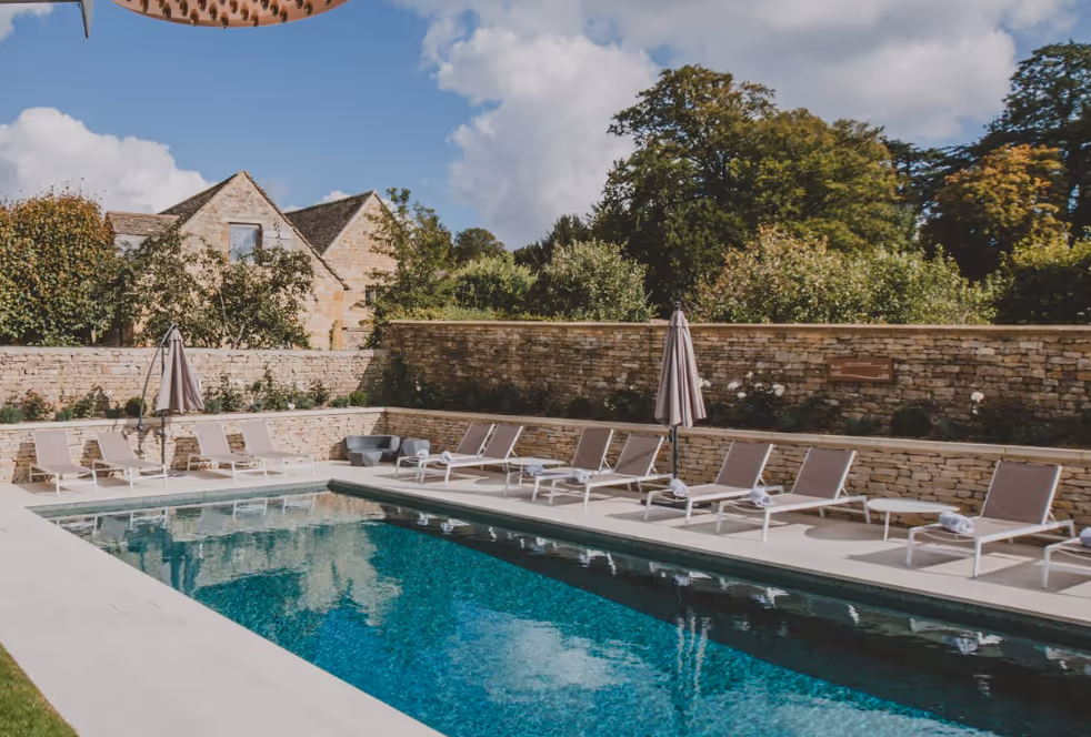 A contemporary barn and Byre conversion tucked privately on the edge of the Temple Guiting estate, offering seven luxurious en-suite bedrooms and exclusive use of the seasonal heated swimming pool. A refined yet relaxed setting for gatherings of up to fourteen guests.