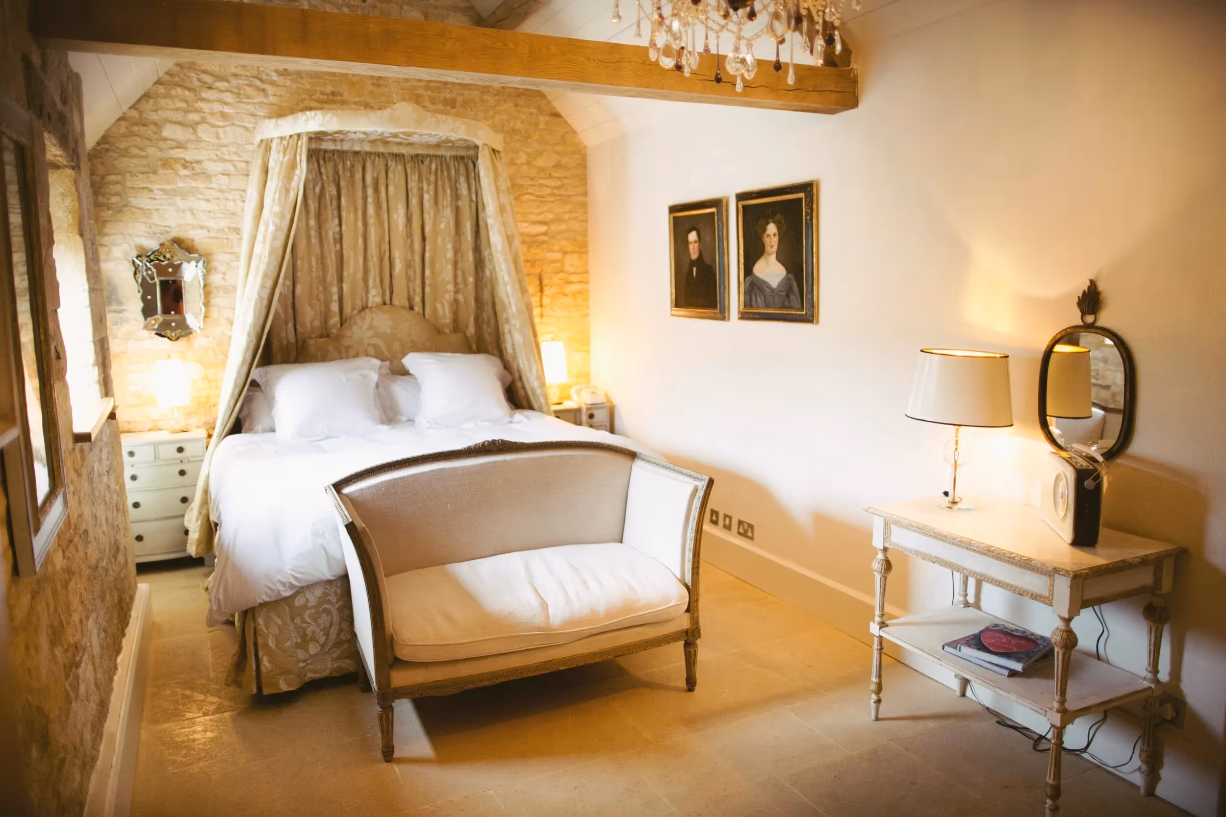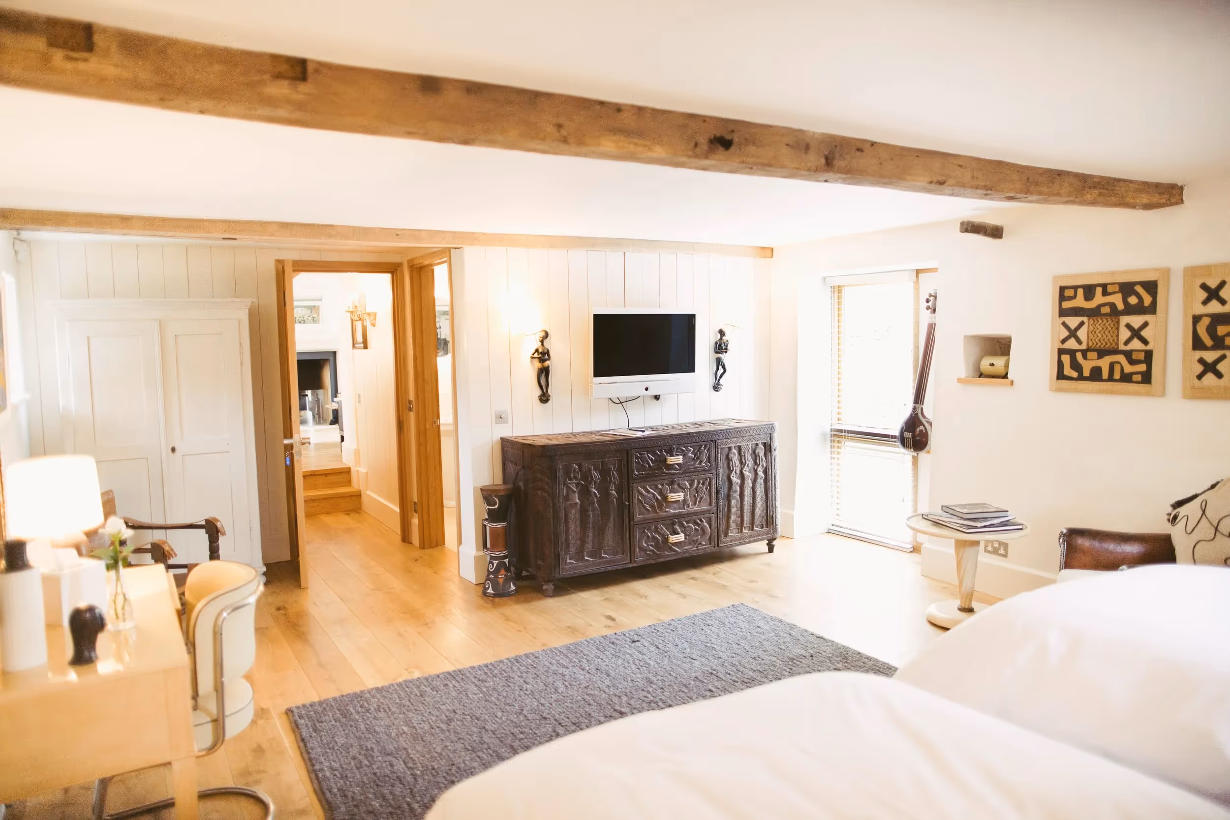 Six individually styled en-suite bedrooms are located within the Barn, four of which can be configured as twins. Themes range from elegant to bold, blending contemporary finishes with Cotswold warmth. The self-contained Cow Byre adds a further en-suite double bedroom, offering flexibility and privacy within the overall layout.