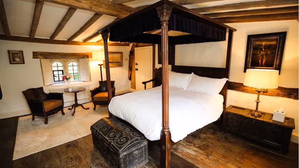 The Grade I listed Manor dates from the 15th century and has been thoughtfully renovated, most recently in 2019 with new bathrooms, ensuring contemporary standards while preserving its historic character. The principal five-bedroom layout includes a sixth twin bedroom positioned between bedrooms four and five, providing additional flexibility. Reception rooms retain their Tudor proportions, and the formal vaulted dining room comfortably seats up to 32 guests — ideal for celebratory dinners and events.