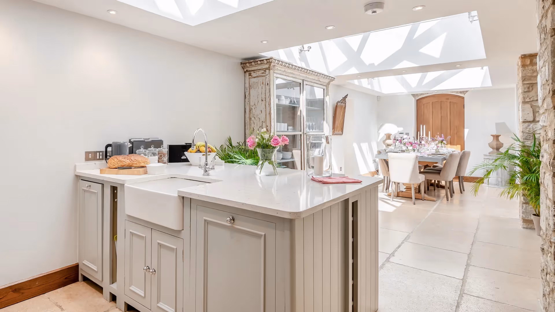 The Brewery is Burford’s former brewery, now reimagined as a spacious and elegant home in the centre of Burford. The house blends period character with modern comfort, offering generous living areas, original details and a welcoming, lived-in feel. Four double bedrooms — three en-suite — provide flexible accommodation for families or groups, and the large open-plan kitchen–dining room is well suited to long meals and relaxed gatherings.