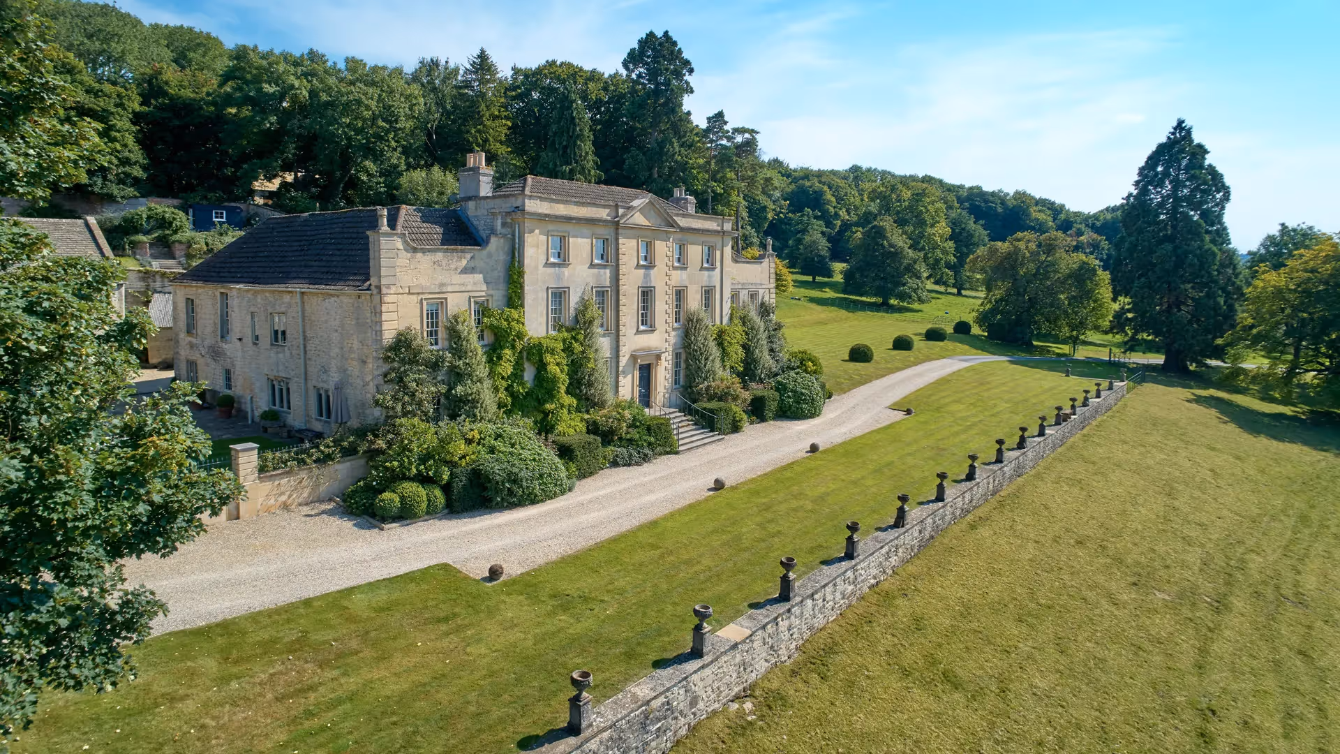 The house sits within its own parkland grounds, approached via a long, sweeping private drive that enhances both privacy and arrival. Its elevated position provides panoramic views over Cheltenham and the surrounding countryside, with lawns and mature trees framing the setting.