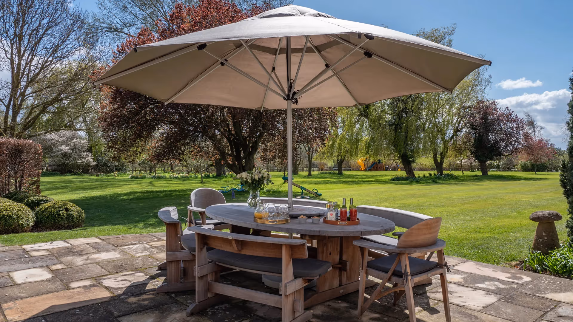 The garden is designed for family use: large lawns, outdoor play areas, and an all-weather tennis court. A kitchen garden sits close to the house, and the setting feels quiet and rural with long views over fields. The on-site maintenance and gardening couple live in a separate building near the tennis court and can provide additional housekeeping at an hourly rate if required.