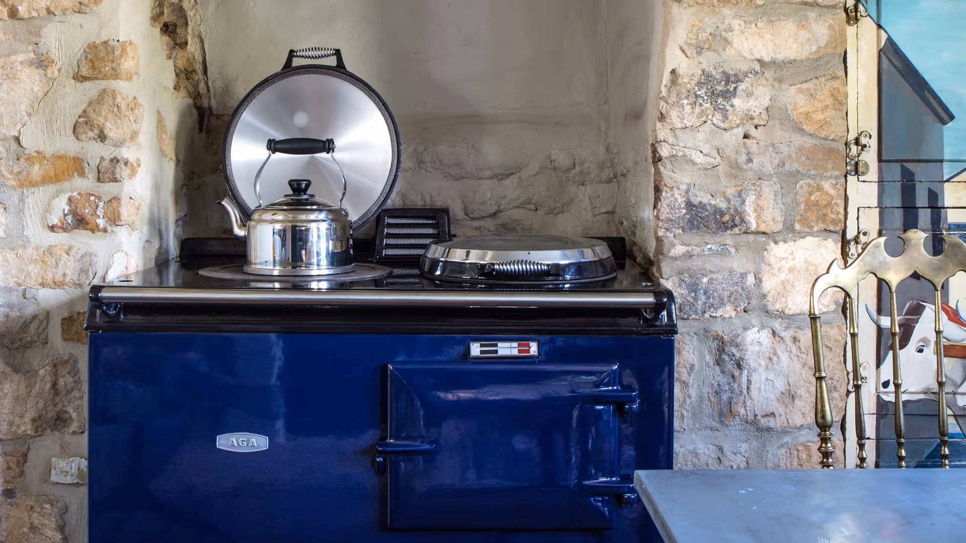 The sitting room exudes warmth and character, with deep armchairs, soft throws and an inviting atmosphere ideal for long evenings by the fire. The adjoining dining kitchen is fully equipped for convivial cooking, featuring two cook stations including a baby AGA, high-quality appliances and thoughtful touches throughout.
